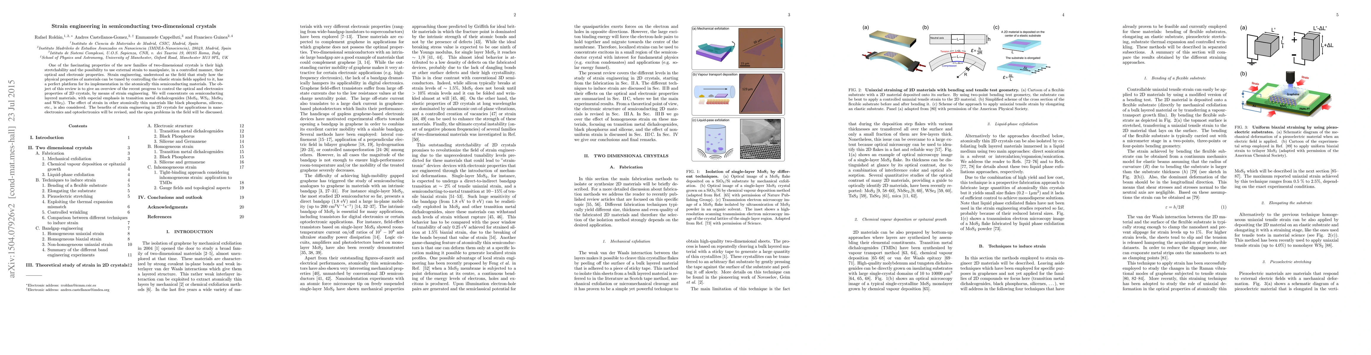 This paper reviews recent advances in strain engineering of semiconducting two-dimensional crystals, focusing on manipulating their optical and electronic properties through controlled elastic strain. Special emphasis is placed on transition metal dichalcogenides, while also considering other materials like black phosphorus and silicene, and discussing potential applications in nanoelectronics and optoelectronics.