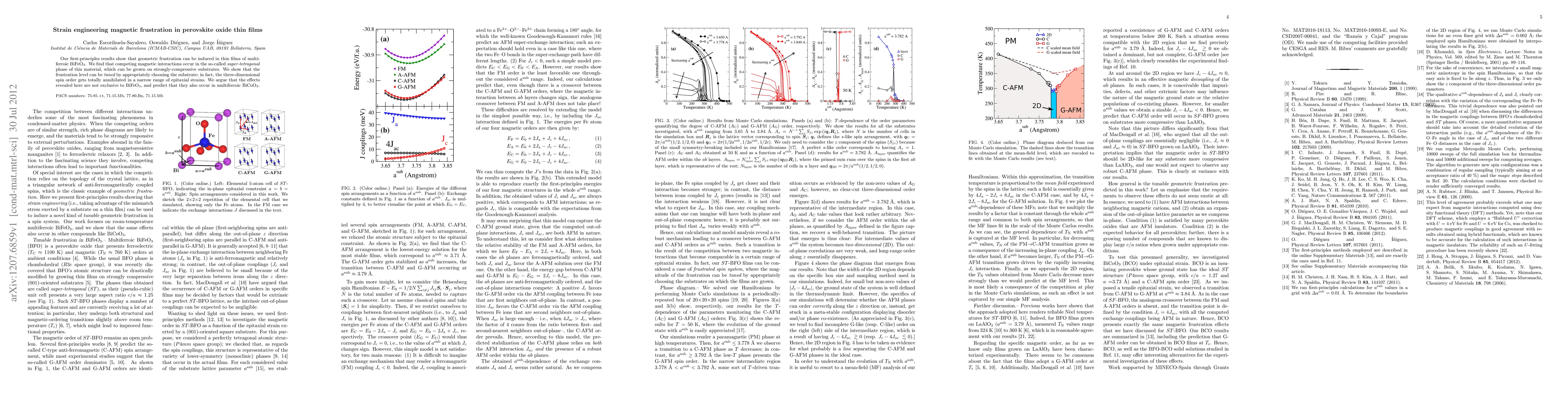 The paper presents a first-principles model to analyze magnetic frustration in strained perovskite oxide thin films, including an extended spin Hamiltonian to accurately describe the magnetic interactions.