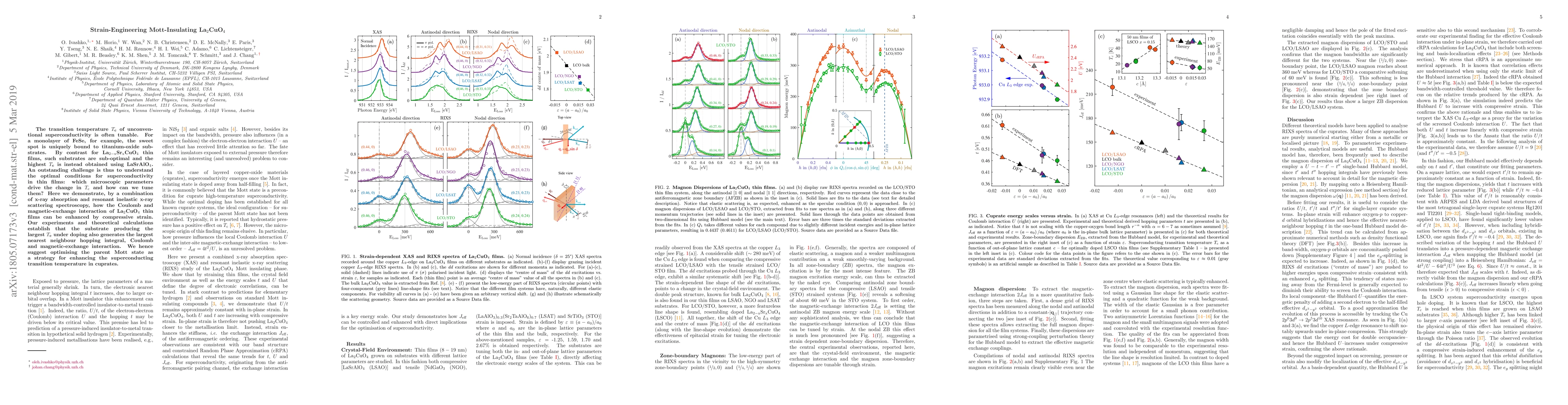 This research demonstrates that compressive strain can enhance Coulomb and magnetic-exchange interactions in La$_2$CuO$_4$ thin films, optimizing the parent Mott state and potentially increasing superconducting transition temperature in cuprates. The findings are supported by x-ray absorption and resonant inelastic x-ray scattering spectroscopy.