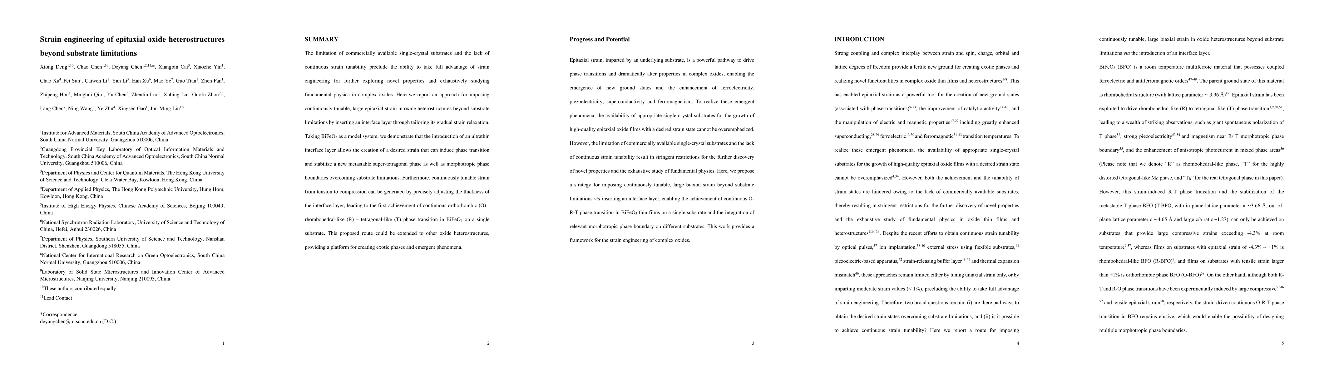 This paper proposes a method to impose continuously tunable, large epitaxial strain in oxide heterostructures by using an ultrathin interface layer, overcoming substrate limitations. The approach enables the creation of new metastable phases and morphotropic phase boundaries in BiFeO3, demonstrating the first continuous O-R-T phase transition on a single substrate, with potential for broader application in other oxide heterostructures.