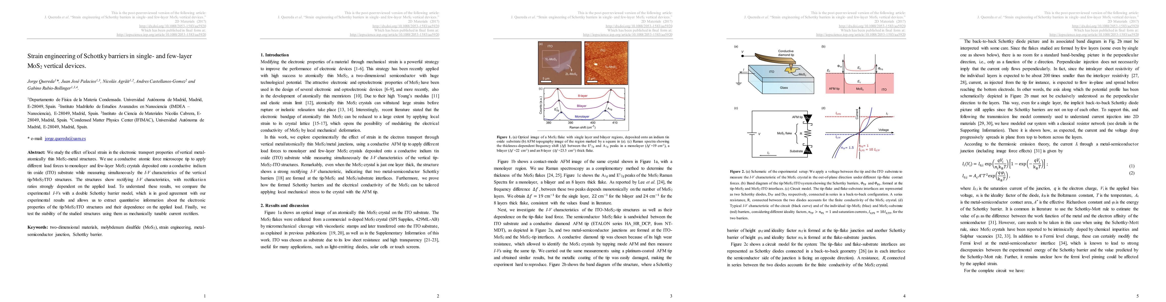 This study investigates how local strain affects the electronic transport in vertical metal-MoS2-metal devices using conductive atomic force microscopy. The devices exhibit rectifying I-V characteristics, with the rectification ratio varying with applied load, and these behaviors are well explained by a double Schottky barrier model.