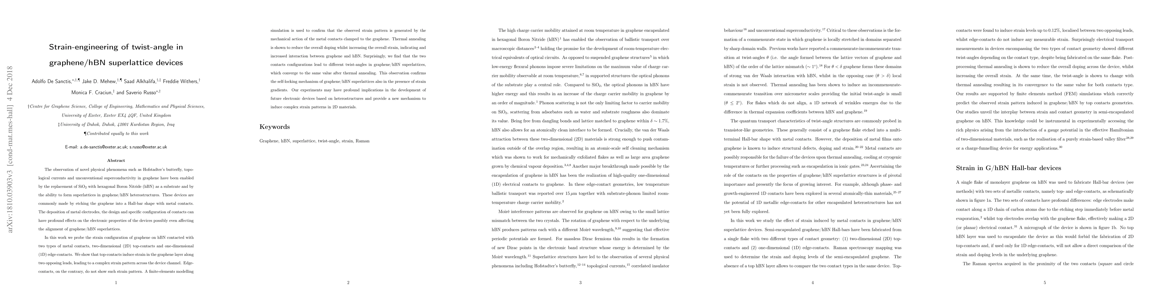 This research explores the effects of different metal contact configurations on the strain engineering in graphene/hBN superlattice devices, demonstrating that top-contacts induce complex strain patterns while edge-contacts do not. Thermal annealing reduces doping and increases strain, revealing distinct twist-angles in superlattices that converge post-annealing, confirming the self-locking mechanism of these materials.