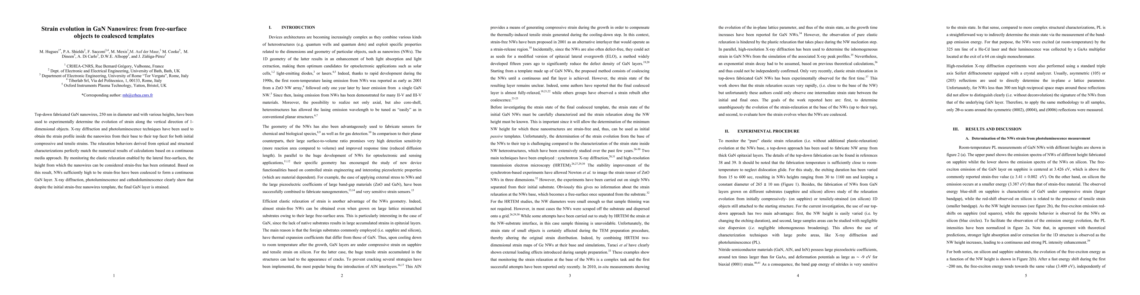 This paper investigates the strain evolution in top-down fabricated GaN nanowires using X-ray diffraction and photoluminescence techniques. The study reveals that sufficiently high nanowires can become strain-free, enabling their coalescence into a continuous GaN layer, which, despite initial strain-free conditions, exhibits strain.