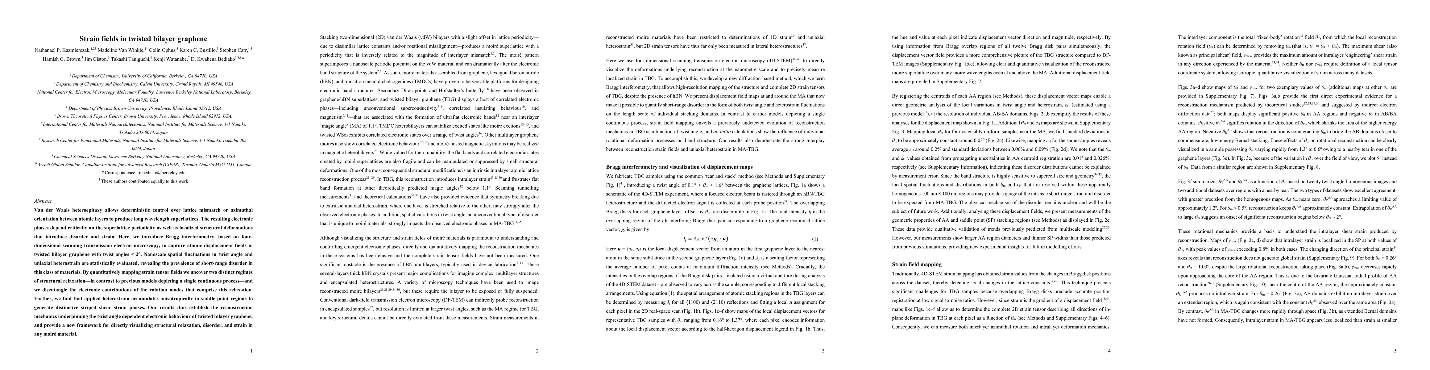 Van der Waals heteroepitaxy allows deterministic control over lattice mismatch or azimuthal orientation between atomic layers to produce long wavelength superlattices. The resulting electronic phases depend critically on the superlattice periodicity as well as localized structural deformations that introduce disorder and strain. Here, we introduce Bragg interferometry, based on four-dimensional scanning transmission electron microscopy, to capture atomic displacement fields in twisted bilayer graphene with twist angles < 2{\deg}. Nanoscale spatial fluctuations in twist angle and uniaxial heterostrain are statistically evaluated, revealing the prevalence of short-range disorder in this class of materials. By quantitatively mapping strain tensor fields we uncover two distinct regimes of structural relaxation -- in contrast to previous models depicting a single continuous process -- and we disentangle the electronic contributions of the rotation modes that comprise this relaxation. Further, we find that applied heterostrain accumulates anisotropically in saddle point regions to generate distinctive striped shear strain phases. Our results thus establish the reconstruction mechanics underpinning the twist angle dependent electronic behaviour of twisted bilayer graphene, and provide a new framework for directly visualizing structural relaxation, disorder, and strain in any moir\'e material.