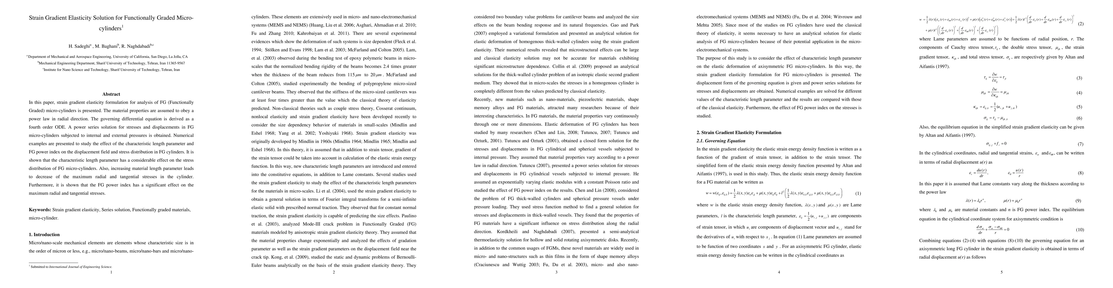 This paper presents a strain gradient elasticity solution for functionally graded micro-cylinders, deriving a fourth-order ODE and obtaining a power series solution for stress and displacement under pressure. Numerical results indicate the characteristic length parameter significantly affects stress distribution, while the FG power index influences maximum radial and tangential stresses.