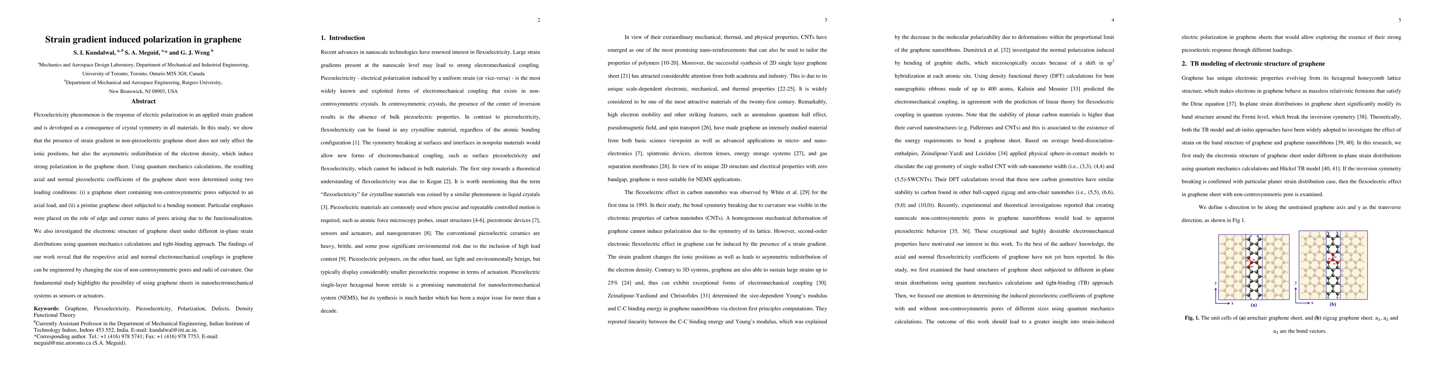 This study demonstrates that strain gradients in non-piezoelectric graphene induce polarization through electron density redistribution, leading to measurable piezoelectric coefficients. The research shows that the size of non-centrosymmetric pores and curvature radii can be engineered to control axial and normal electromechanical coupling, suggesting potential applications in nanoelectromechanical devices.