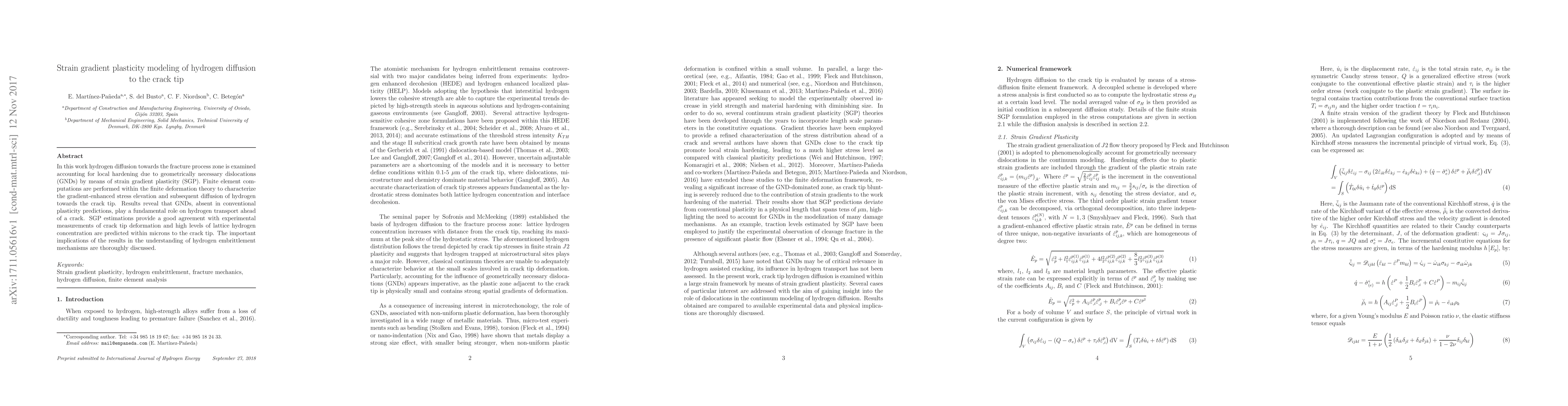 This study employs strain gradient plasticity to model hydrogen diffusion towards a crack tip, highlighting the role of geometrically necessary dislocations. Finite element analysis reveals that these dislocations significantly influence hydrogen transport, leading to high hydrogen concentrations near the crack tip, with results aligning well with experimental observations.