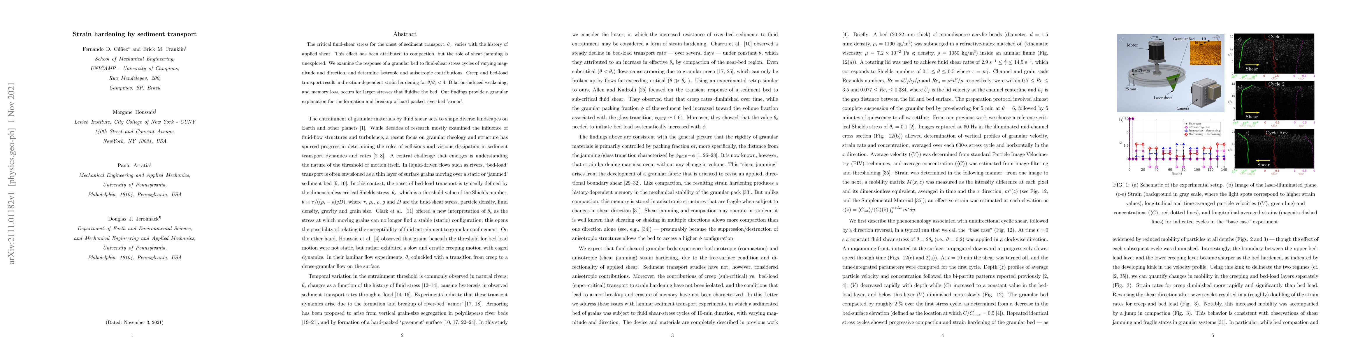 This paper investigates how sediment transport affects strain hardening in granular beds under fluid-shear stress, revealing anisotropic strain hardening due to creep and bed-load transport, while dilation-induced weakening occurs at higher stresses. The findings explain the formation and breakup of hard-packed river-bed 'armor'.