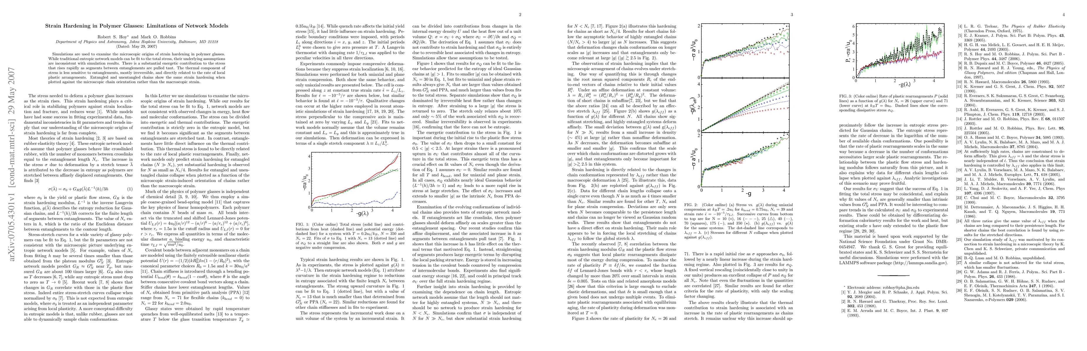 This paper investigates the microscopic origins of strain hardening in polymer glasses, revealing that traditional entropic network models fail to capture the energetic contributions to stress, which are instead linked to the rapid stretching of segments between entanglements. The study finds that strain hardening is better understood through the rate of local plastic arrangements rather than macroscopic strain.