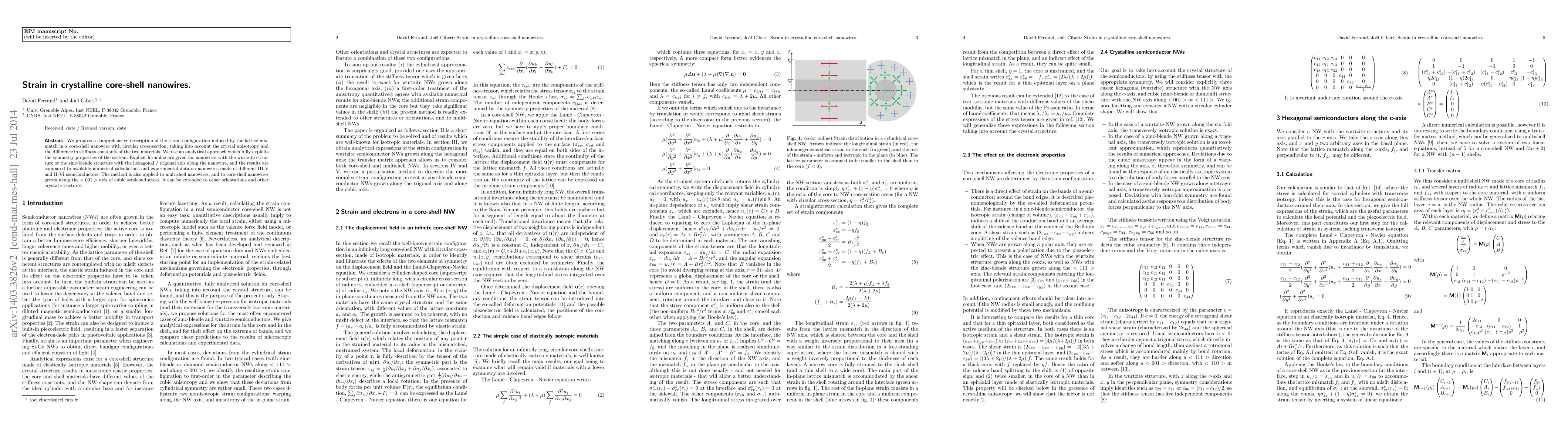 This paper analytically calculates the strain in core-shell nanowires due to lattice mismatch, considering crystal anisotropy and material stiffness. Results for wurtzite, zinc-blende, and cubic nanowires are compared with numerical and experimental data.