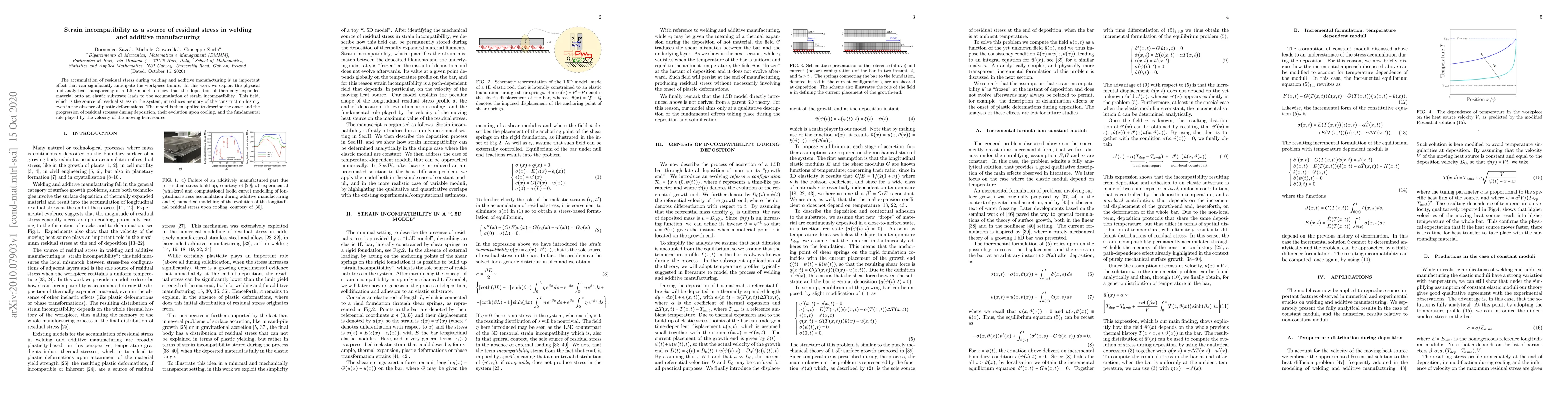 The accumulation of residual stress during welding and additive manufacturing is an important effect that can significantly anticipate the workpiece failure. In this work we exploit the physical and analytical transparency of a 1.5D model to show that the deposition of thermally expanded material onto an elastic substrate leads to the accumulation of strain incompatibility. This field, which is the source of residual stress in the system, introduces memory of the construction history even in the absence of plastic deformations. The model is then applied to describe the onset and the progression of residual stresses during deposition, their evolution upon cooling, and the fundamental role played by the velocity of the moving heat source.
