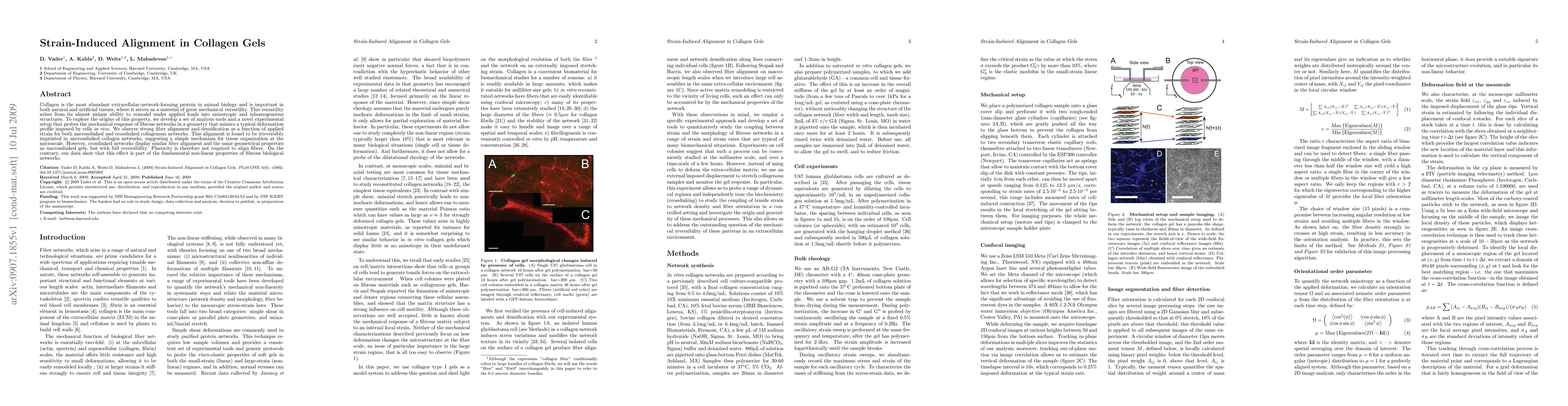 This study investigates the mechanical response of collagen gels under strain, revealing strong fiber alignment and densification in both uncrosslinked and crosslinked networks. Uncrosslinked gels exhibit irreversible alignment, suggesting a mechanism for microscale tissue organization, while crosslinked gels show reversible alignment, indicating that plasticity is not necessary for fiber alignment in these networks.