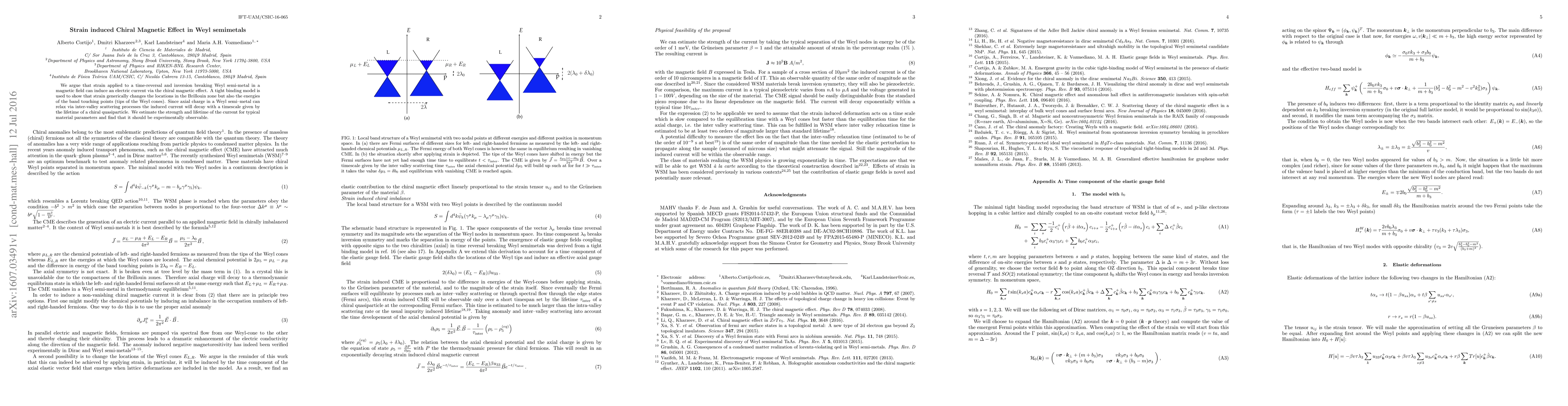 Title: Strain induced Chiral Magnetic Effect in Weyl semimetals Summary: Strain applied to Weyl semimetals in a magnetic field can induce an electric current through the chiral magnetic effect, with the current's strength and decay timescale determined by the material's chiral quasiparticle lifetime, making it experimentally observable.