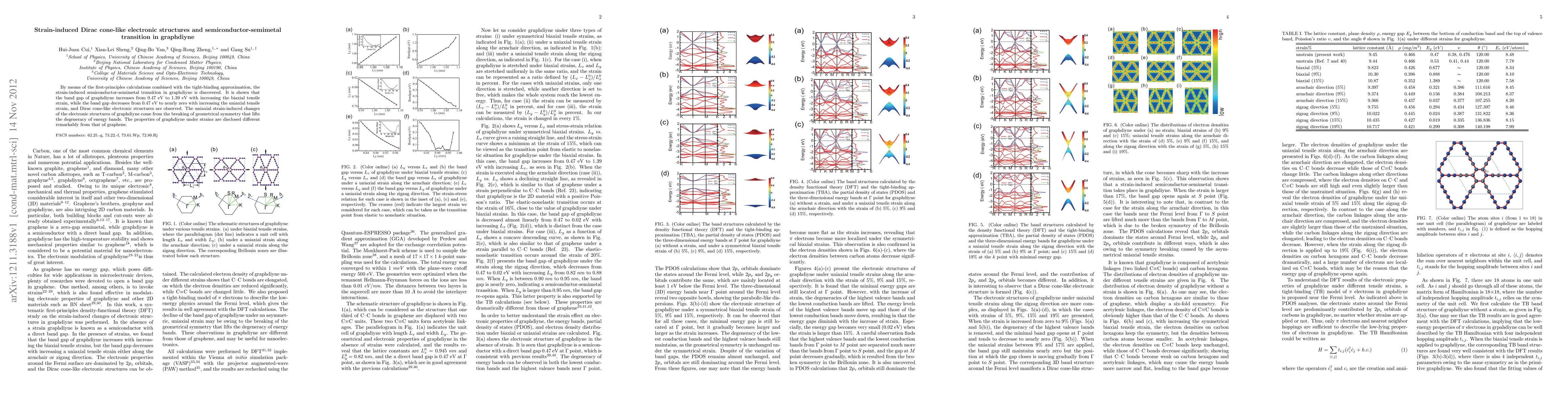This study reveals that graphdiyne undergoes a semiconductor-semimetal transition under strain, with the band gap varying significantly under different strain types. Biaxial tensile strain increases the band gap, while uniaxial tensile strain reduces it to nearly zero, revealing Dirac cone-like electronic structures due to symmetry breaking.