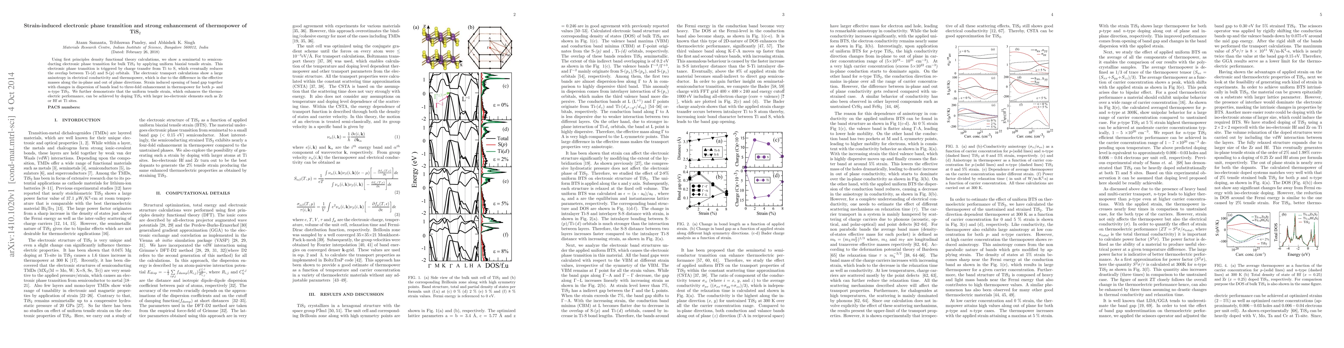 Using first principles density functional theory calculations, we show a semimetal to semiconducting electronic phase transition for bulk TiS 2 by applying uniform biaxial tensile strain. This electronic phase transition is triggered by charge transfer from Ti to S, which eventually reduces the overlap between Ti-(d) and S-(p) orbitals. The electronic transport calculations show a large anisotropy in electrical conductivity and thermopower, which is due to the difference in the effective masses along the in-plane and out of plane directions. Strain induced opening of band gap together with changes in dispersion of bands lead to three-fold enhancement in thermopower for both p- and n-type TiS2 . We further demonstrate that the uniform tensile strain, which enhances the thermoelectric performance, can be achieved by doping TiS2 with larger iso-electronic elements such as Zr or Hf at Ti sites.