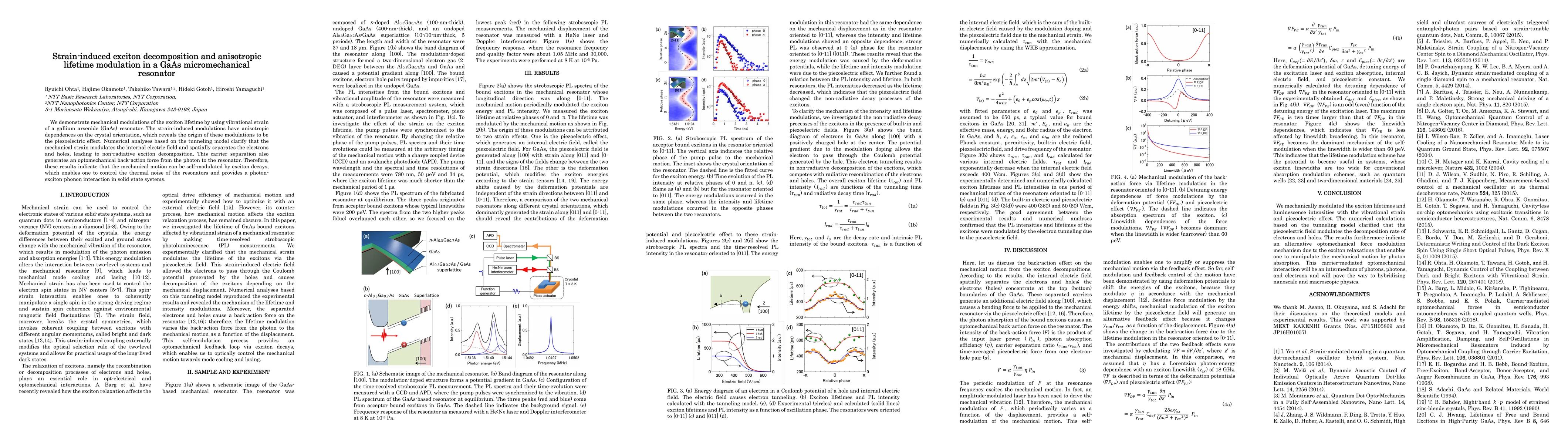 We demonstrate mechanical modulations of the exciton lifetime by using vibrational strain of a gallium arsenide (GaAs) resonator. The strain-induced modulations have anisotropic dependences on the crystal orientation, which reveals the origin of these modulations to be the piezoelectric effect. Numerical analyses based on the tunneling model clarify that the mechanical strain modulates the internal electric field and spatially separates the electrons and holes, leading to non-radiative exciton decomposition. This carrier separation also generates an optomechanical back-action force from the photon to the resonator. Therefore, these results indicate that the mechanical motion can be self-modulated by exciton decays, which enables one to control the thermal noise of the resonators and provides a photon-exciton-phonon interaction in solid-state systems.