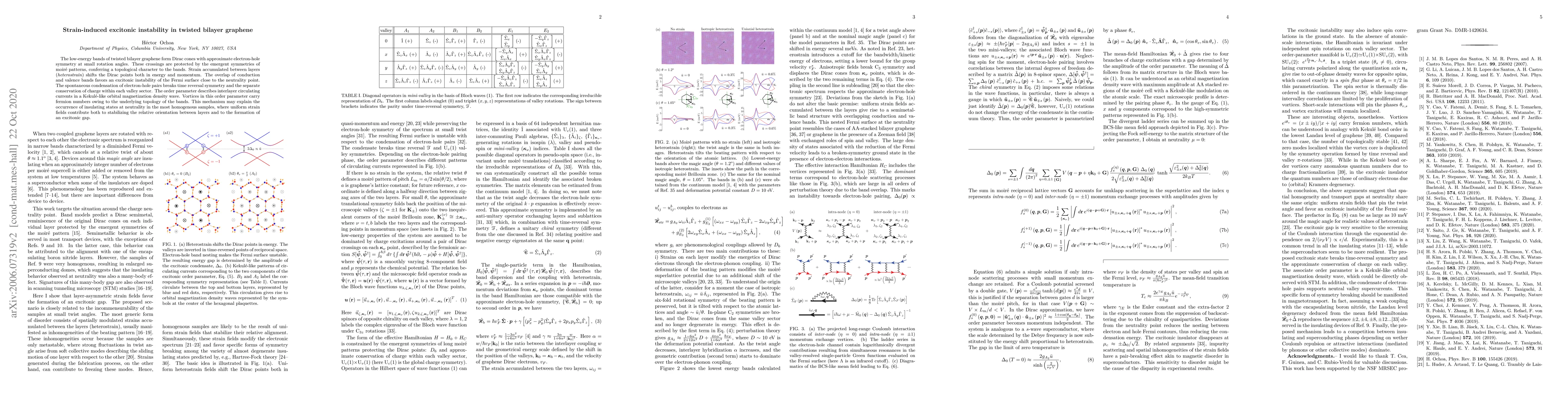 The low-energy bands of twisted bilayer graphene form Dirac cones with approximate electron-hole symmetry at small rotation angles. These crossings are protected by the emergent symmetries of moir\'e patterns, conferring a topological character to the bands. Strain accumulated between layers (heterostrain) shifts the Dirac points both in energy and momentum. The overlap of conduction and valence bands favors an excitonic instability of the Fermi surface close to the neutrality point. The spontaneous condensation of electron-hole pairs breaks time reversal symmetry and the separate conservation of charge within each valley sector. The order parameter describes interlayer circulating currents in a Kekul\'e-like orbital magnetization density wave. Vortices in this order parameter carry fermion numbers owing to the underlying topology of the bands. This mechanism may explain the occurrence of insulating states at neutrality in the most homogenous samples, where uniform strain fields contribute both to stabilizing the relative orientation between layers and to the formation of an excitonic gap.