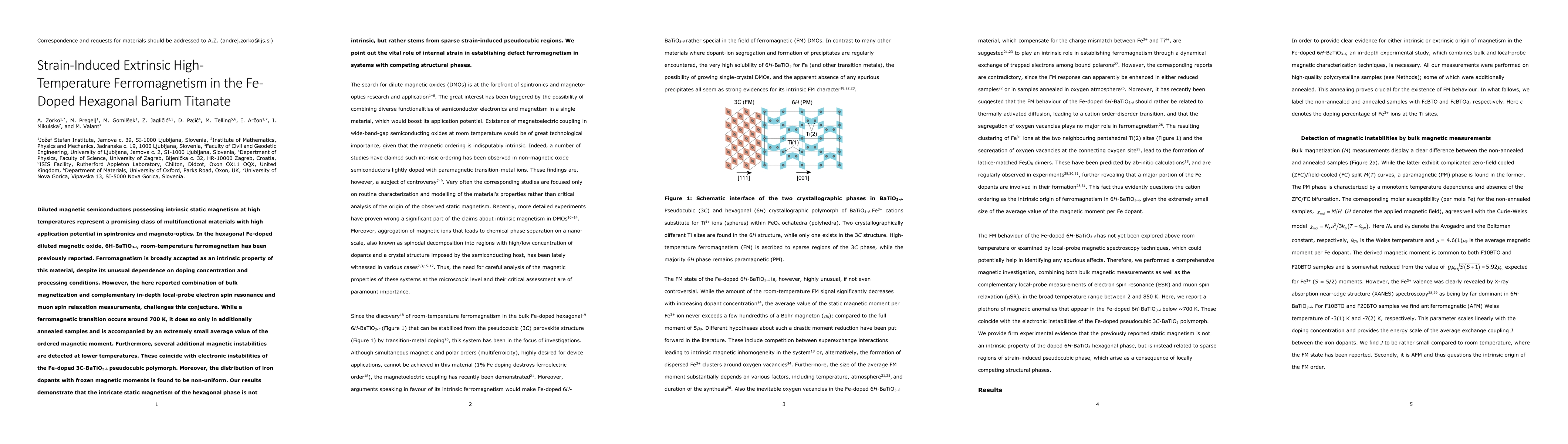 This paper reveals that high-temperature ferromagnetism in Fe-doped hexagonal barium titanate is not intrinsic but strain-induced, arising from pseudocubic regions formed due to internal strain. The study highlights the importance of strain in establishing defect ferromagnetism in materials with competing structural phases.
