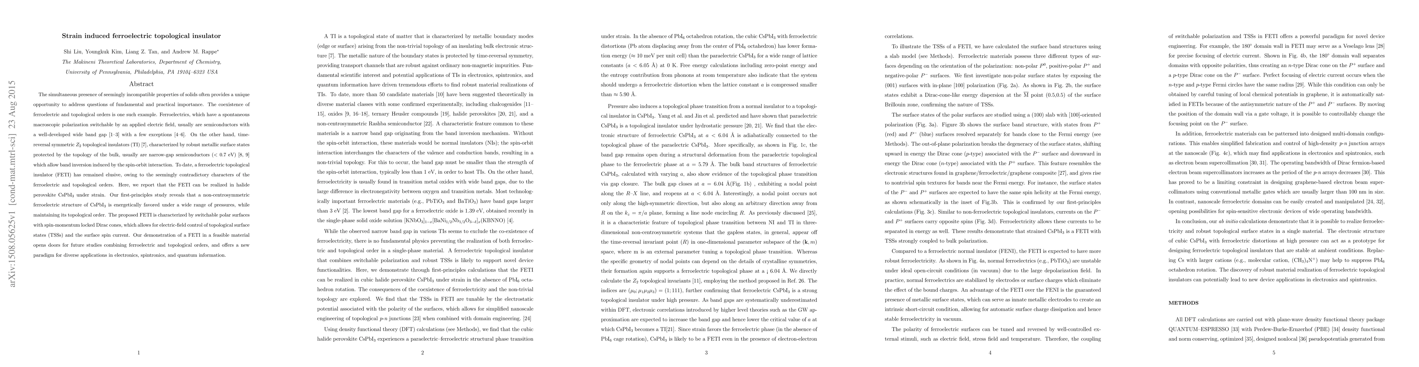 This paper reports the realization of a ferroelectric topological insulator (FETI) in halide perovskite CsPbI$_3$ under strain, combining ferroelectric and topological orders. The study reveals that CsPbI$_3$ maintains its topological order while exhibiting a non-centrosymmetric ferroelectric structure under pressure, enabling electric-field control of topological surface states and surface spin current.