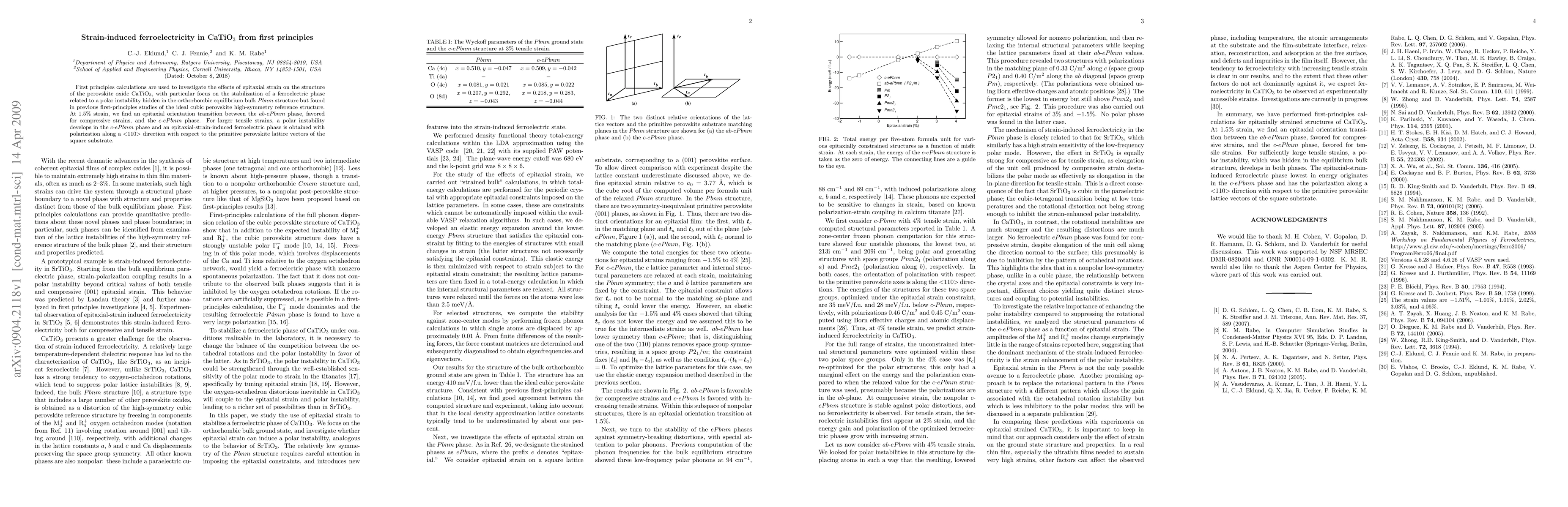First principles calculations were employed to study the effects of epitaxial strain on CaTiO3's structure, focusing on stabilizing a ferroelectric phase related to a hidden polar instability in its orthorhombic equilibrium bulk Pbnm structure.