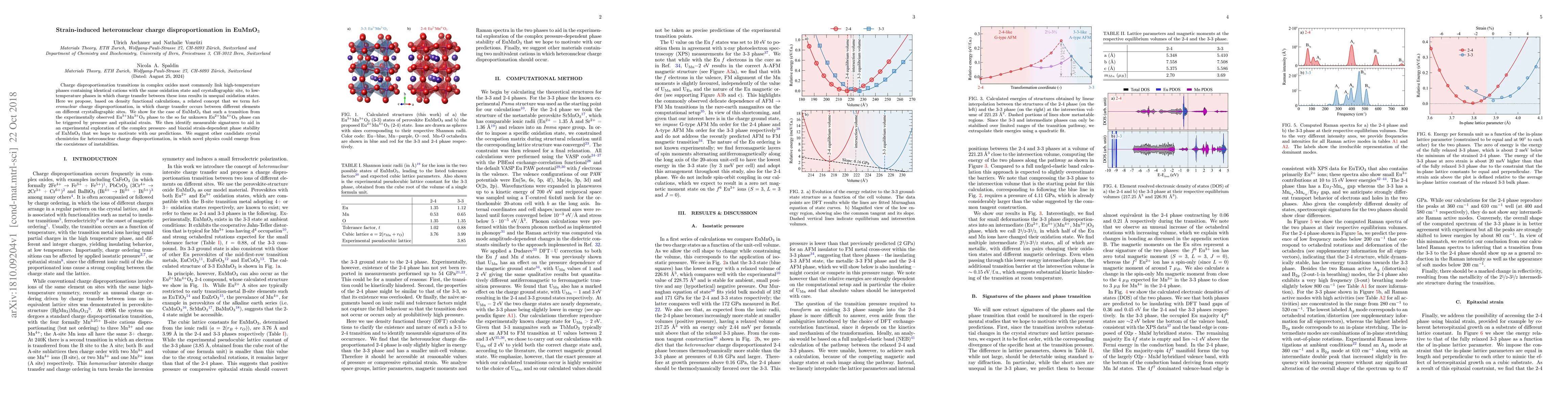 This paper proposes a novel concept of heteronuclear charge disproportionation in EuMnO$_3$, where charge transfer occurs between different elements on different crystallographic sites. The study predicts that pressure and epitaxial strain can trigger a transition from the Eu$^{3+}$Mn$^{3+}$O$_3$ to the Eu$^{2+}$Mn$^{4+}$O$_3$ phase, offering measurable signatures for experimental validation.