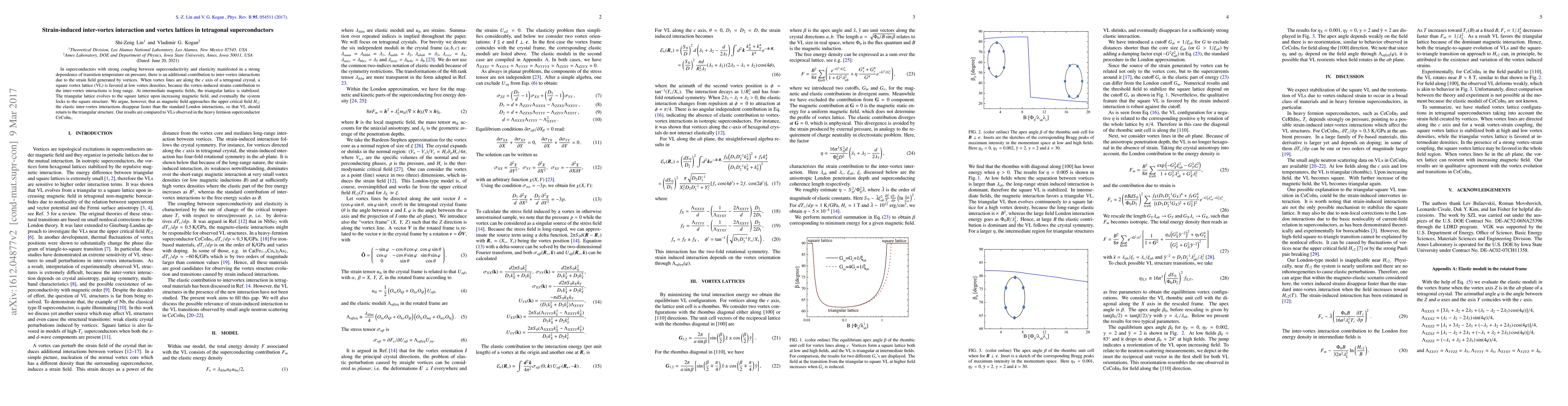 This paper investigates the strain-induced inter-vortex interactions in tetragonal superconductors, showing that a square vortex lattice is favored at low vortex densities due to long-range vortex-induced strains. As magnetic fields increase, the triangular lattice becomes stable before reverting to the square structure, though near the critical magnetic field, elastic interactions diminish, leading to a return to the triangular lattice.
