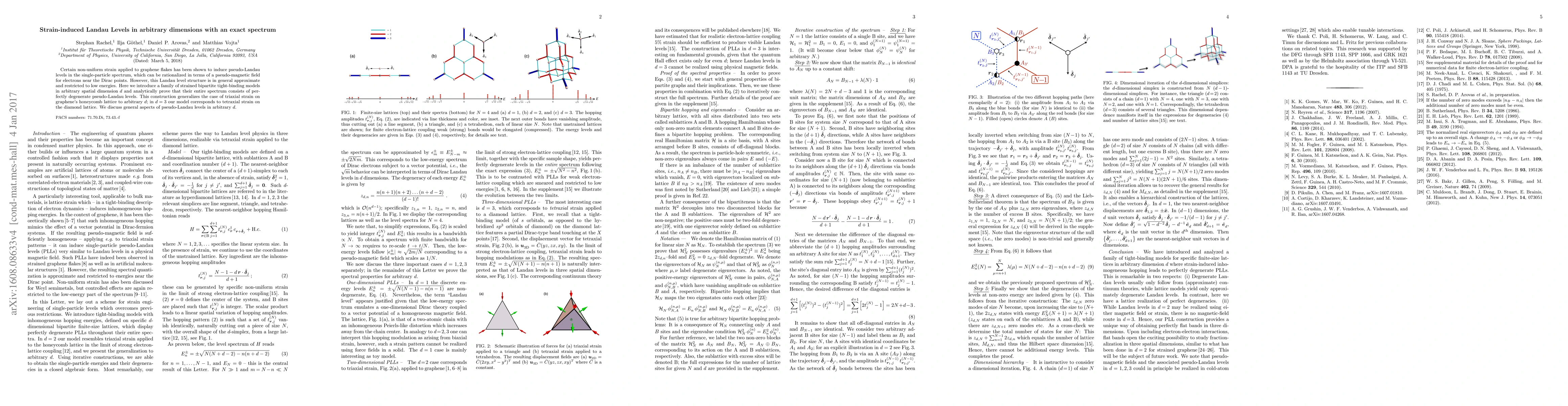 Certain non-uniform strain applied to graphene flakes has been shown to induce pseudo-Landau levels in the single-particle spectrum, which can be rationalized in terms of a pseudo-magnetic field for electrons near the Dirac points. However, this Landau level structure is in general approximate and restricted to low energies. Here we introduce a family of strained bipartite tight-binding models in arbitrary spatial dimension d and analytically prove that their entire spectrum consists of perfectly degenerate pseudo-Landau levels. This construction generalizes the case of triaxial strain on graphene's honeycomb lattice to arbitrary d; in d=3 our model corresponds to tetraxial strain on the diamond lattice. We discuss general aspects of pseudo-Landau levels in arbitrary d.