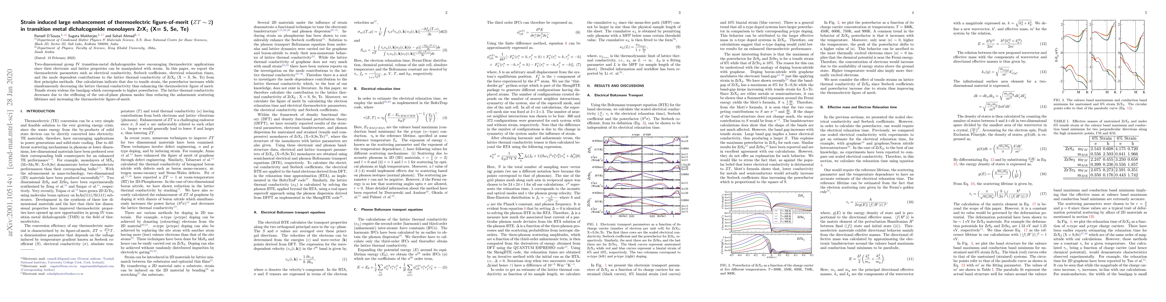 Two-dimensional group IV transition-metal dichalcogenides have encouraging thermoelectric applications since their electronic and lattice properties can be manipulated with strain. In this paper, we report the thermoelectric parameters such as electrical conductivity, Seebeck coefficients, electrical relaxation times, and the mode dependent contributions to the lattice thermal conductivity of ZrX$_2$ (X = S, Se, Te) from first principles methods. Our calculations indicate that due to tensile strain, the powerfactor increases while simultaneously decreasing the lattice thermal conductivity thus enhancing the thermoelectric figure of merit. Tensile strain widens the bandgap which corresponds to higher powerfactor. The lattice thermal conductivity decreases due to the stiffening of the out-of-plane phonon modes thus reducing the anharmonic scattering lifetimes and increasing the thermoelectric figure-of-merit.