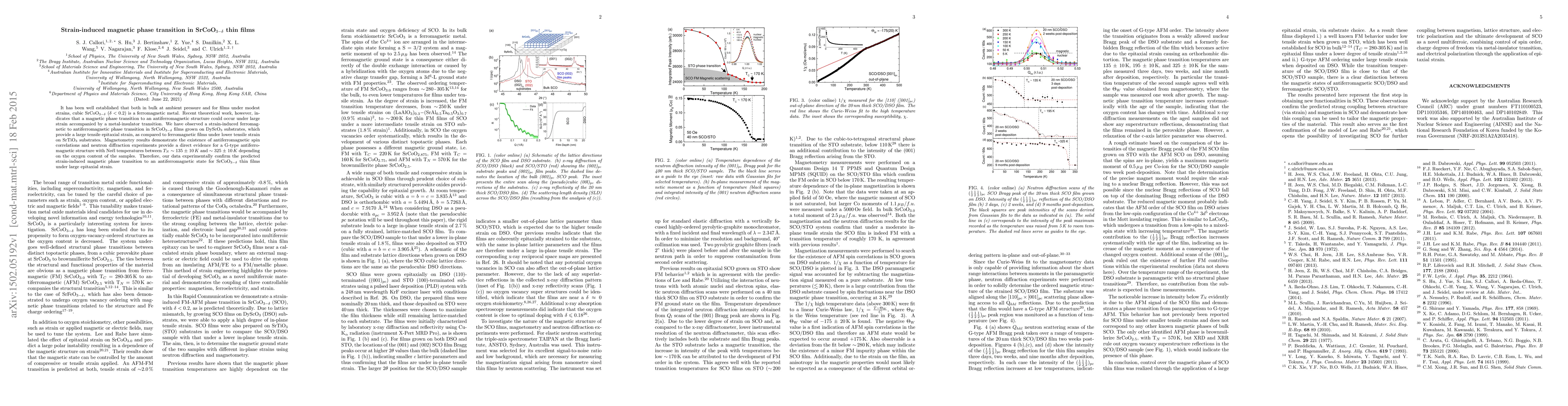 This study confirms the theoretical prediction of a strain-induced magnetic phase transition in SrCoO$_{3-\delta}$ thin films, showing a shift from ferromagnetic to antiferromagnetic behavior under large tensile epitaxial strain, as evidenced by magnetometry and neutron diffraction experiments.