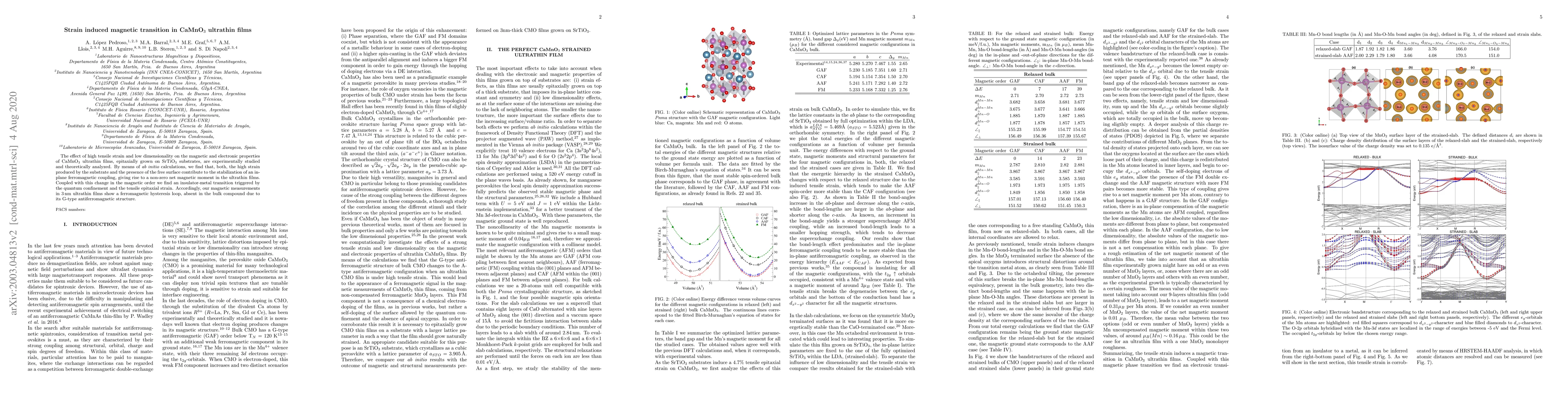 The effect of high tensile strain and low dimensionality on the magnetic and electronic properties of CaMnO$_3$ ultrathin films, epitaxially grown on SrTiO$_3$ substrates, are experimentally studied and theoretically analyzed. By means of ab initio calculations, we find that, both, the high strain produced by the substrate and the presence of the free surface contribute to the stabilization of an in-plane ferromagnetic coupling, giving rise to a non-zero net magnetic moment in the ultrathin films. Coupled with this change in the magnetic order we find an insulator-metal transition triggered by the quantum confinement and the tensile epitaxial strain. Accordingly, our magnetic measurements in 3nm ultrathin films show a ferromagnetic hysteresis loop, absent in the bulk compound due to its G-type antiferromagnetic structure.
