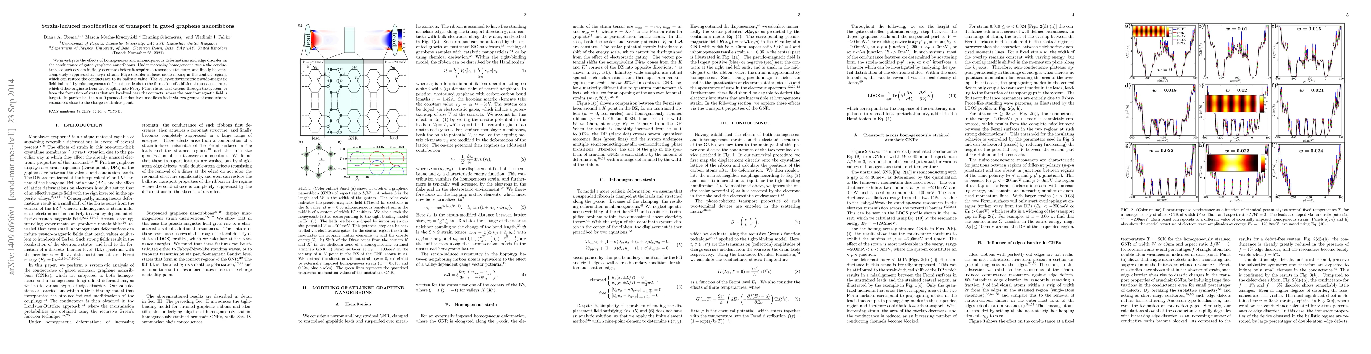 This paper examines how strain and edge disorder affect the conductance of gated graphene nanoribbons, finding that homogeneous strain initially reduces conductance before causing complete suppression, while edge disorder can restore it. Inhomogeneous strain induces pseudo-magnetic fields leading to additional resonance states, particularly manifesting near the charge neutrality point.