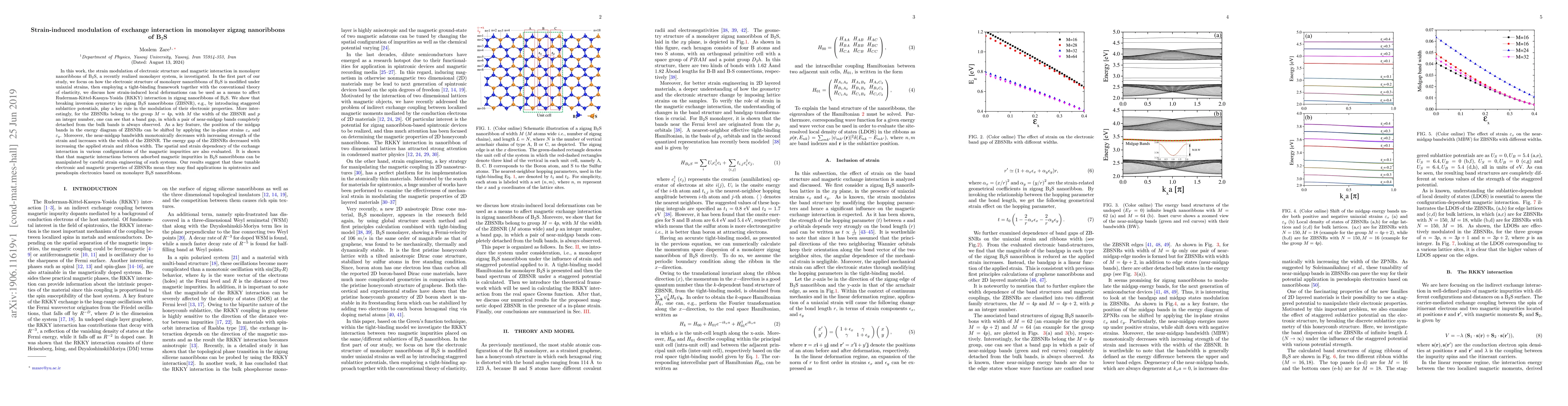 In this work, the strain modulation of electronic structure and magnetic interaction in monolayer nanoribbons of B$_2$S, a recently realized monolayer system, is investigated. In the first part of our study, we focus on how the electronic structure of monolayer nanoribbons of B$_2$S is modified under uniaxial strains, then employing a tight-binding framework together with the conventional theory of elasticity, we discuss how strain-induced local deformations can be used as a means to affect Ruderman-Kittel-Kasuya-Yosida (RKKY) interaction in zigzag nanoribbons of B$_2$S. We show that breaking inversion symmetry in zigzag B$_2$S nanoribbons (ZBSNR), e.g., by introducing staggered sublattice potentials, play a key role in the modulation of their electronic properties. More interestingly, for the ZBSNRs belong to the group $M=4p$, with $M$ the width of the ZBSNR and $p$ an integer number, one can see that a band gap, in which a pair of near-midgap bands completely detached from the bulk bands is always observed. As a key feature, the position of the midgap bands in the energy diagram of ZBSNRs can be shifted by applying the in-plane strains $\varepsilon_x$ and $\varepsilon_y$. Moreover, the near-midgap bandwidth monotonically decreases with increasing strength of the strain and increases with the width of the ZBSNR. The energy gap of the ZBSNRs decreased with increasing the applied strain and ribbon width. The spatial and strain dependency of the exchange interaction in various configurations of the magnetic impurities are also evaluated. The magnetic interactions between adsorbed magnetic impurities in B$_2$S nanoribbons can be manipulated by careful strain engineering of such systems. Our results suggest that these tunable electronic and magnetic properties of ZBSNRs mean they may find applications in spintronics and pseudospin electronics based on monolayer B$_2$S nanoribbons.