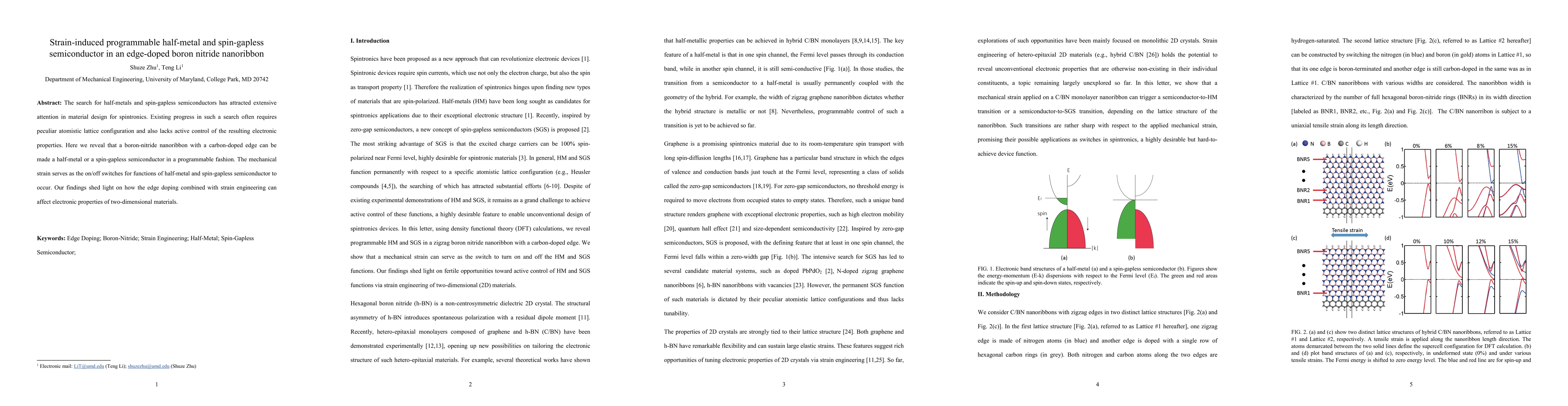 This paper demonstrates that a carbon-doped boron nitride nanoribbon can be engineered to exhibit half-metallic or spin-gapless semiconductor properties through mechanical strain. The study highlights the potential of strain-induced control over electronic properties in two-dimensional materials.