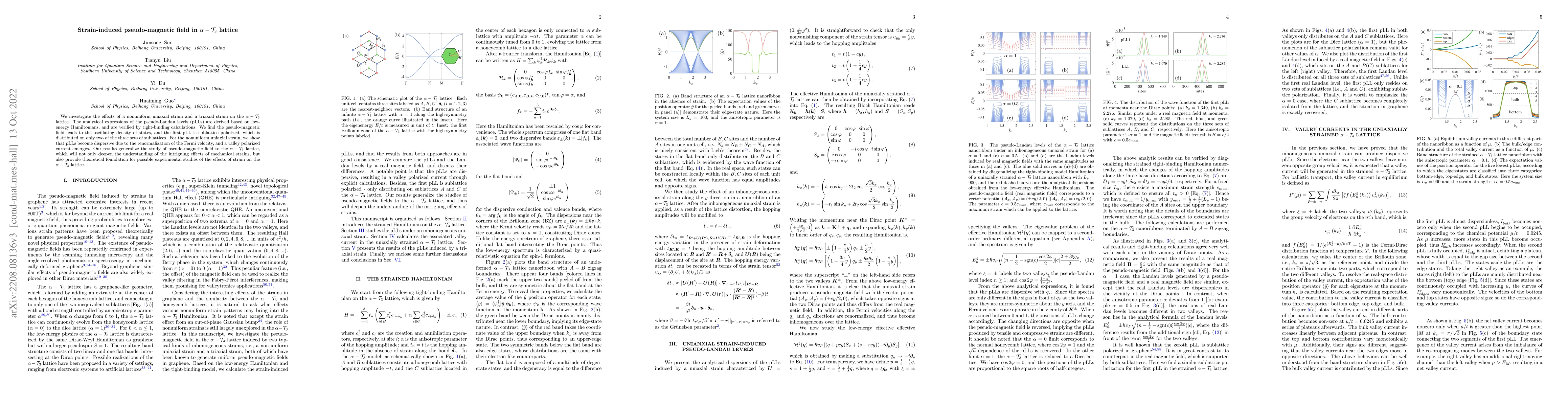This paper investigates the impact of uniaxial and triaxial strains on the $\alpha-{\cal T}_3$ lattice, deriving pseudo-Landau levels and revealing a sublattice-polarized first pseudo-Landau level. It demonstrates the emergence of a valley-polarized current under nonuniform uniaxial strain, providing a theoretical foundation for future experimental studies on strain effects.