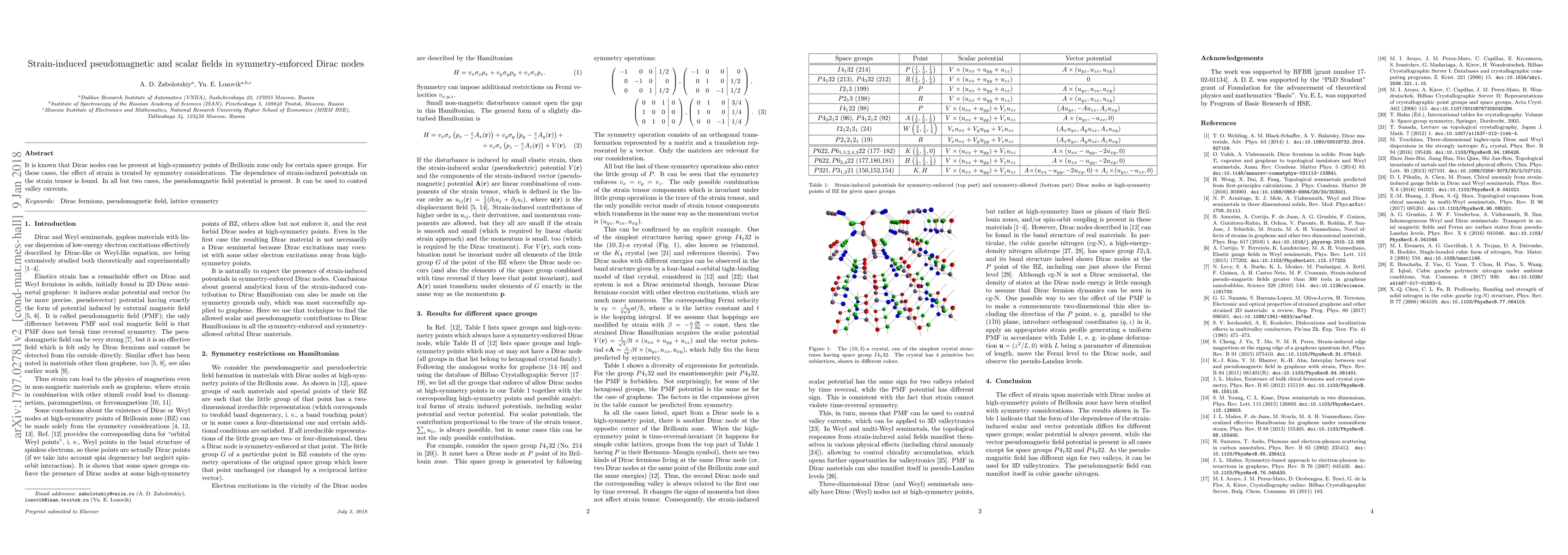 It is known that Dirac nodes can be present at high-symmetry points of Brillouin zone only for certain space groups. For these cases, the effect of strain is treated by symmetry considerations. The dependence of strain-induced potentials on the strain tensor is found. In all but two cases, the pseudomagnetic field potential is present. It can be used to control valley currents.