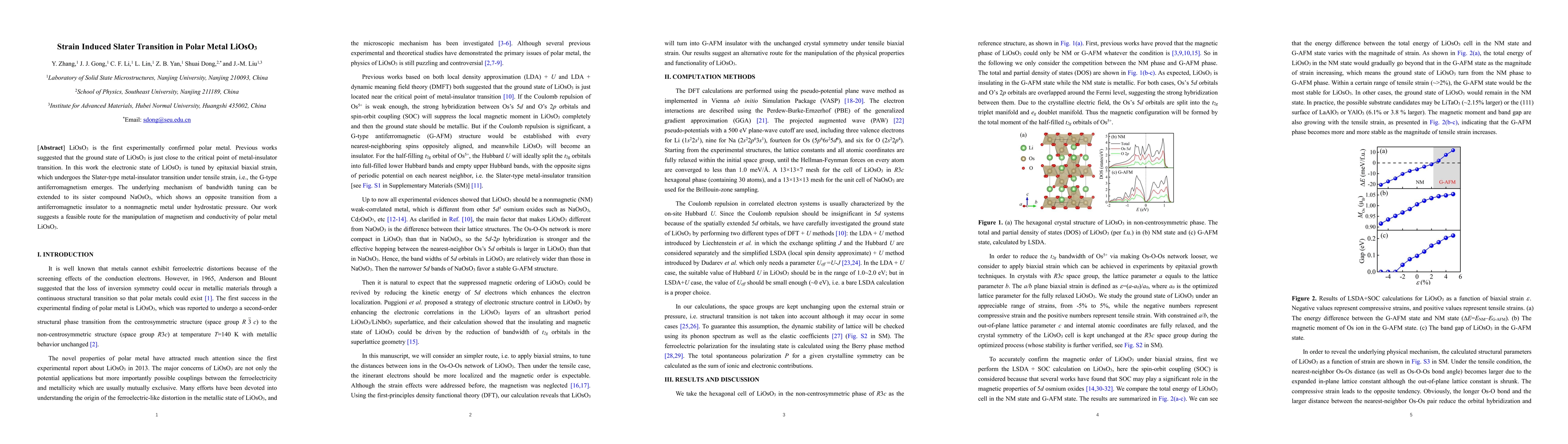 This study investigates the strain-induced Slater transition in the polar metal LiOsO$_3$, demonstrating that tensile strain can induce a metal-insulator transition accompanied by G-type antiferromagnetism. The findings suggest a potential method for controlling magnetism and conductivity in LiOsO$_3$ and extend to its sister compound NaOsO$_3$, which undergoes an opposite transition under pressure.