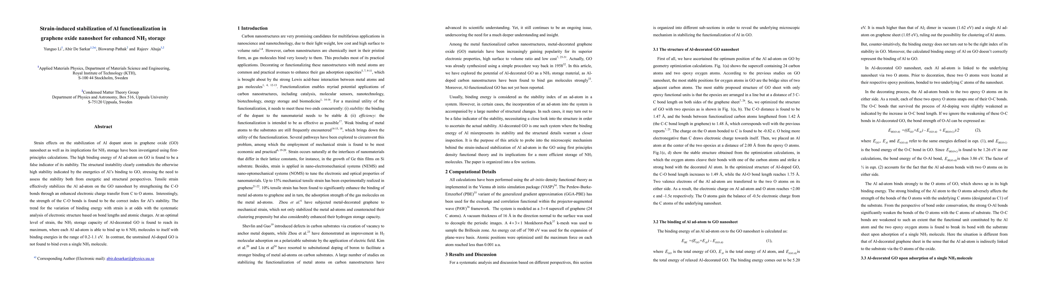 Strain effects on the stabilization of Al ad-atom on graphene oxide(GO)nanosheet as well as its implications for NH3 storage have been investigated using first-principles calculations.The binding energy of Al ad-atom on GO is found to be a false indicator of its stability.Tensile strain is found to be very effective in stabilizing the Al ad-atom on GO.It strengthens the C-O bonds through an enhanced charge transfer from C to O atoms. Interestingly,C-O bond strength is found to be the correct index for Al's stability.Optimally strained Al-functionalized GO binds up to 6 NH3 molecules,while it binds no NH3 molecule in unstrained condition.