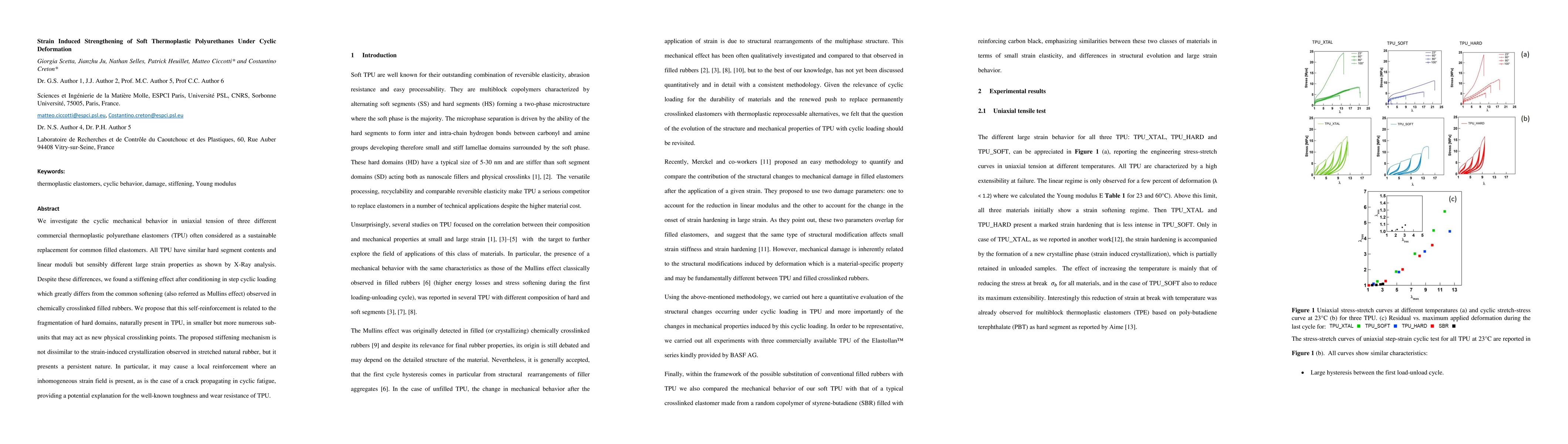 We investigate the cyclic mechanical behavior in uniaxial tension of three different commercial thermoplastic polyurethane elastomers (TPU) often considered as a sustainable replacement for common filled elastomers. All TPU have similar hard segment contents and linear moduli but sensibly different large strain properties as shown by X-Ray analysis. Despite these differences, we found a stiffening effect after conditioning in step cyclic loading which greatly differs from the common softening (also referred as Mullins effect) observed in chemically crosslinked filled rubbers. We propose that this self-reinforcement is related to the fragmentation of hard domains, naturally present in TPU, in smaller but more numerous sub-units that may act as new physical crosslinking points. The proposed stiffening mechanism is not dissimilar to the strain-induced crystallization observed in stretched natural rubber, but it presents a persistent nature. In particular, it may cause a local reinforcement where an inhomogeneous strain field is present, as is the case of a crack propagating in cyclic fatigue, providing a potential explanation for the well-known toughness and wear resistance of TPU