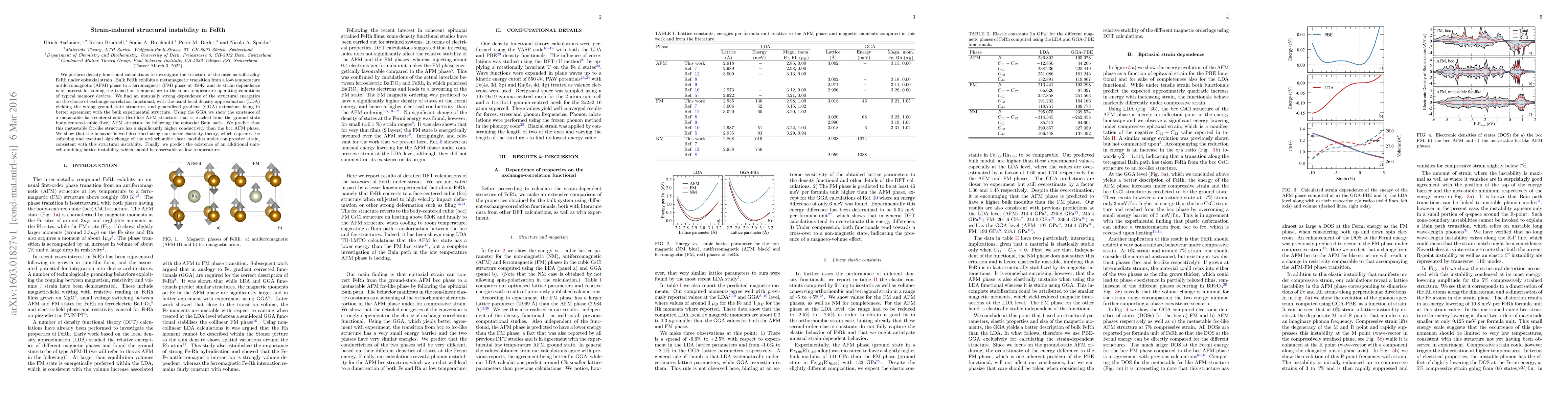 We perform density functional calculations to investigate the structure of the inter-metallic alloy FeRh under epitaxial strain. Bulk FeRh exhibits a metamagnetic transition from a low-temperature antiferromagnetic (AFM) phase to a ferromagnetic (FM) phase at 350K, and its strain dependence is of interest for tuning the transition temperature to the room-temperature operating conditions of typical memory devices. We find an unusually strong dependence of the structural energetics on the choice of exchange-correlation functional, with the usual local density approximation (LDA) yielding the wrong ground-state structure, and generalized gradient (GGA) extensions being in better agreement with the bulk experimental structure. Using the GGA we show the existence of a metastable face-centered-cubic (fcc)-like AFM structure that is reached from the ground state body-centered-cubic (bcc) AFM structure by following the epitaxial Bain path. We predict that this metastable fcc-like structure has a significantly higher conductivity than the bcc AFM phase. We show that the behavior is well described using non-linear elasticity theory, which captures the softening and eventual sign change of the orthorhombic shear modulus under compressive strain, consistent with this structural instability. Finally, we predict the existence of an additional unit-cell-doubling lattice instability, which should be observable at low temperature.
