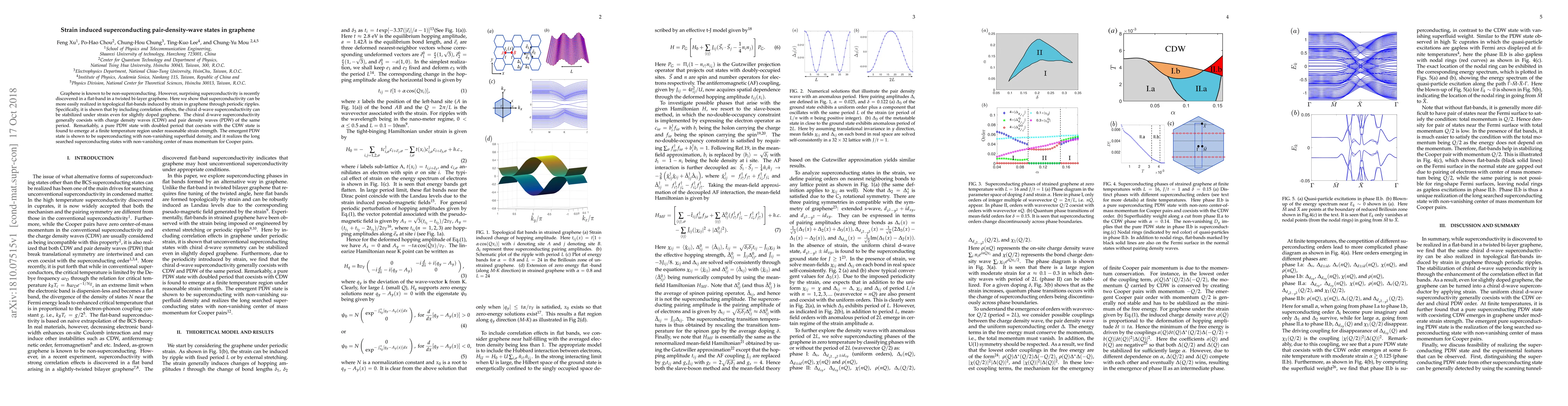 This paper reveals that strain-induced topological flat-bands in graphene can stabilize superconductivity, specifically chiral d-wave superconductivity, alongside charge density waves and pair density waves. Notably, a unique superconducting pair-density-wave state with doubled period emerges under certain strain conditions, featuring non-zero center of mass momentum for Cooper pairs.