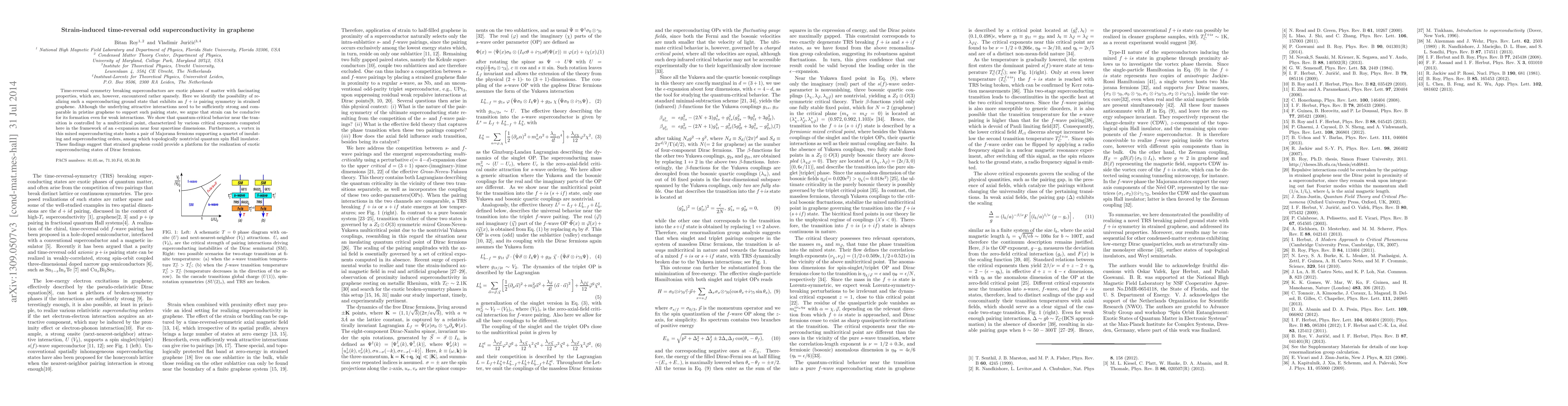 Time-reversal symmetry breaking superconductors are exotic phases of matter with fascinating properties, which are, however, encountered rather sparsely. Here we identify the possibility of realizing such a superconducting ground state that exhibits an $f+is$ pairing symmetry in strained graphene. Although the underlying attractive interactions need to be sufficiently strong and comparable in pristine graphene to support such pairing state, we argue that strain can be conducive for its formation even for weak interactions. We show that quantum-critical behavior near the transition is controlled by a multicritical point, characterized by various critical exponents computed here in the framework of an $\epsilon$-expansion near four spacetime dimensions. Furthermore, a vortex in this mixed superconducting state hosts a pair of Majorana fermions supporting a quartet of insulating and superconducting orders, among which topologically nontrivial quantum spin Hall insulator. These findings suggest that strained graphene could provide a platform for the realization of exotic superconducting states of Dirac fermions.
