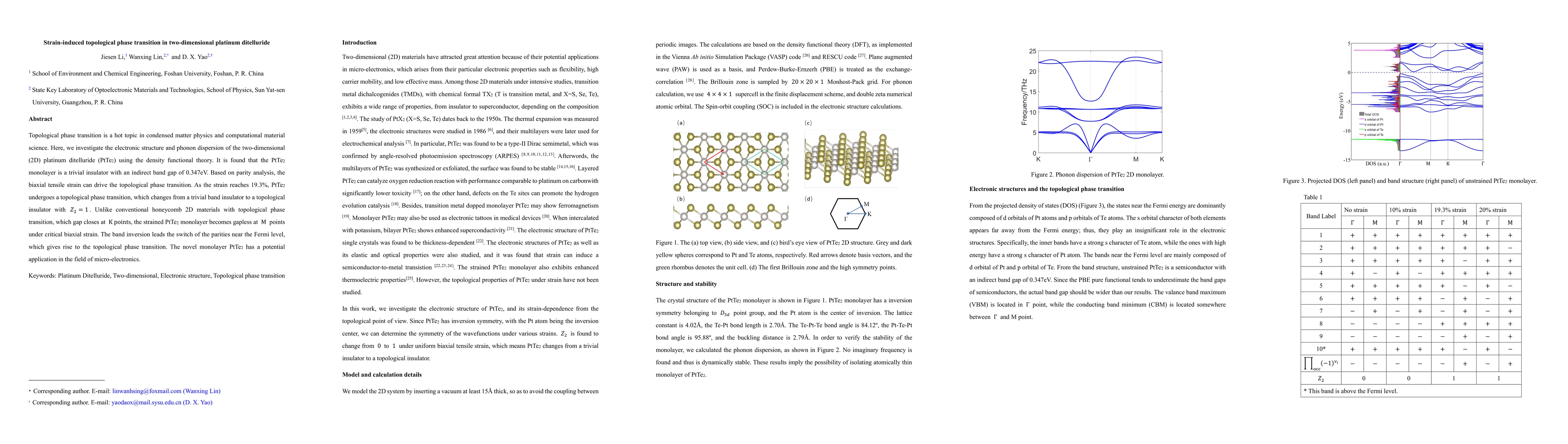This study reveals that the 2D material platinum ditelluride ($PtTe_2$) undergoes a topological phase transition from a trivial insulator to a topological insulator under biaxial tensile strain, with a critical strain of 19.3%. Unlike conventional materials, the transition occurs at M points instead of K points, indicating potential applications in micro-electronics.