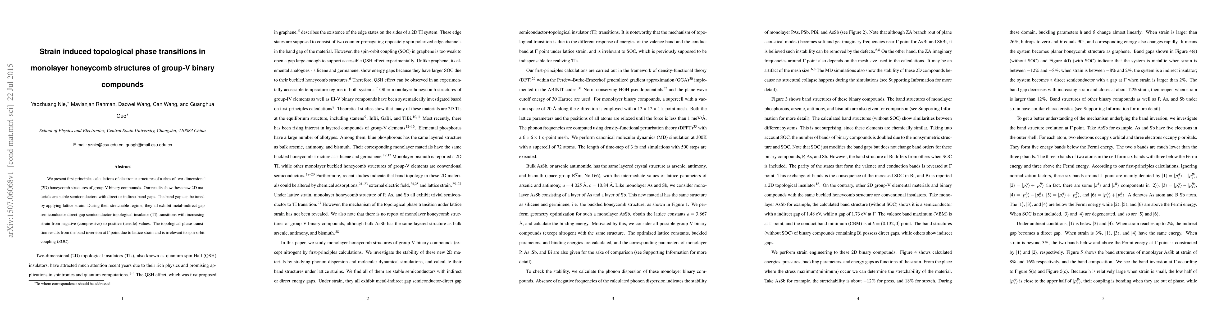 This paper investigates the electronic structures of monolayer honeycomb structures of group-V binary compounds, revealing their stability and tunable band gaps. The study finds that lattice strain can induce topological phase transitions from metal to semiconductor and finally to topological insulator, without reliance on spin-orbit coupling.