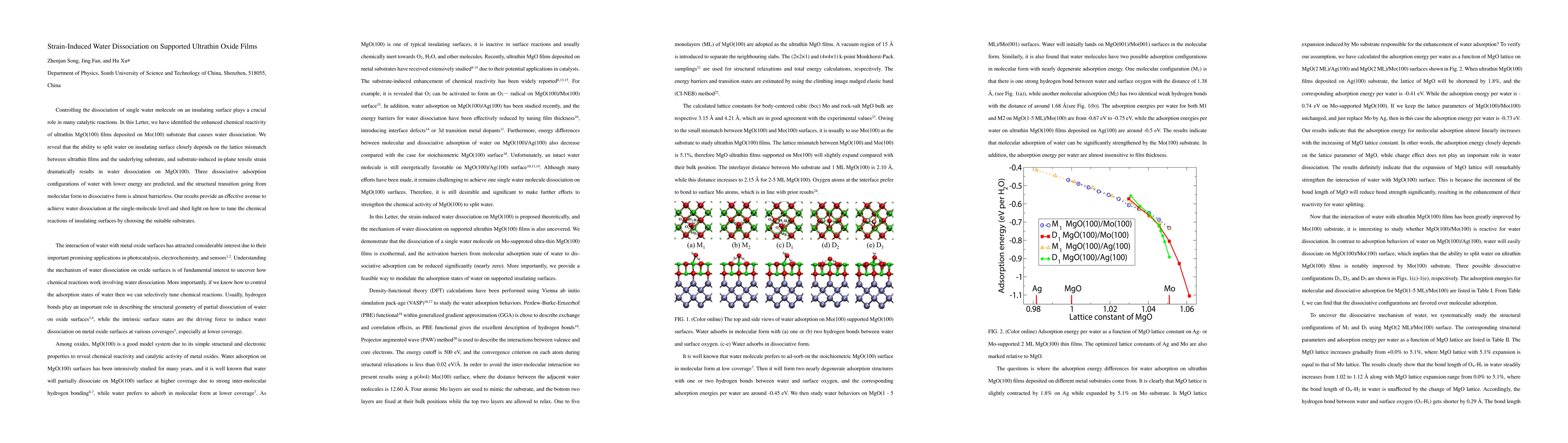 This paper investigates the enhanced reactivity of ultrathin MgO(100) films on Mo(100) substrates, demonstrating that substrate-induced strain can induce water dissociation on an insulating surface. The study reveals that lattice mismatch and in-plane tensile strain facilitate the transition from molecular to dissociative water adsorption, providing a pathway for controlling single-molecule water dissociation.