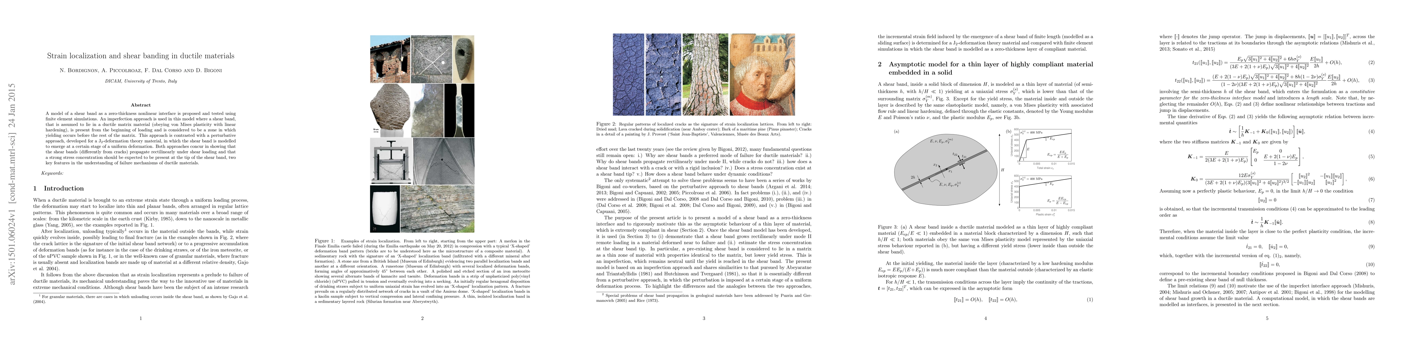 This paper proposes a model for shear bands in ductile materials as zero-thickness nonlinear interfaces, tested via finite element simulations. It contrasts an imperfection approach, where shear bands exist from the start, with a perturbative approach, showing both predict linear shear band propagation and stress concentration at the tips.