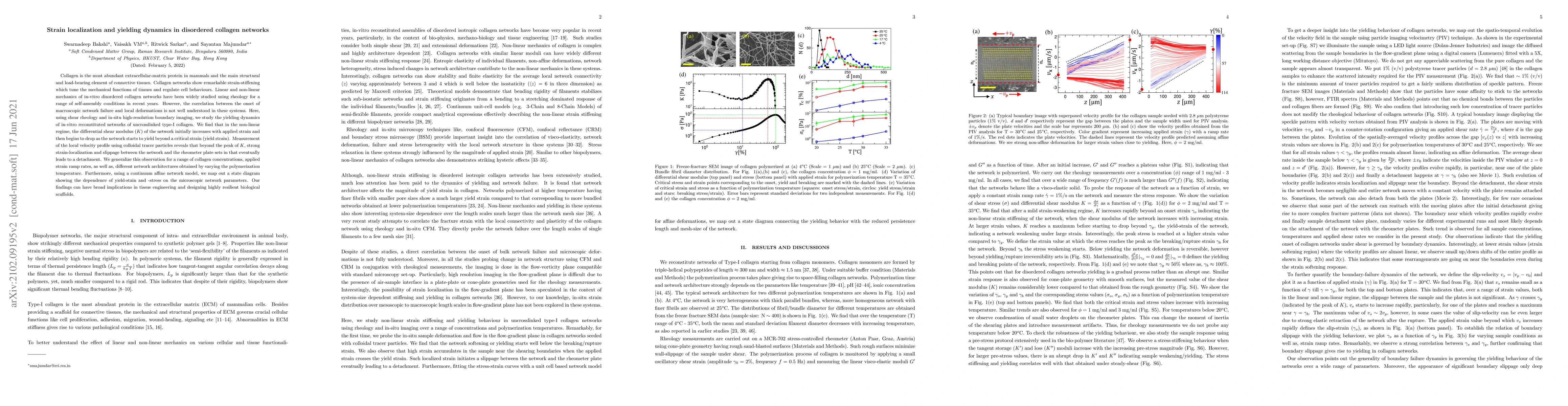 Collagen is the most abundant extracellular-matrix protein in mammals and the main structural and load-bearing element of connective tissues. Collagen networks show remarkable strain-stiffening properties which tune the mechanical functions of tissues and regulate cell behaviours. Linear and non-linear mechanical properties of in-vitro disordered collagen networks have been widely studied using rheology for a range of self-assembly conditions in recent years. However, a one to one correlation between the onset of macroscopic network failure and local deformations inside the sample is yet to be established in these systems. Here, using shear rheology and in-situ high-resolution boundary imaging, we study the yielding dynamics of in-vitro reconstituted networks of uncrosslinked type-I collagen. We find that in the non-linear regime, the differential shear modulus ($K$) of the network initially increases with applied strain and then begins to drop as the network starts to yield beyond a critical strain (yield strain). Measurement of the local velocity profile using colloidal tracer particles reveals that beyond the peak of $K$, strong strain-localization and slippage between the network and the rheometer plate sets in that eventually leads to a detachment. We generalize this observation for a range of collagen concentrations, applied strain ramp rates, as well as different network architectures obtained by varying the polymerization temperature. Furthermore, by fitting the stress vs strain data with a continuum affine network model, we map out a state diagram showing the dependence of yield-stain and -stress on the reduced persistence length and mesh size of the network. Our findings can have broad implications in tissue engineering, particularly, in designing highly resilient biological scaffolds.