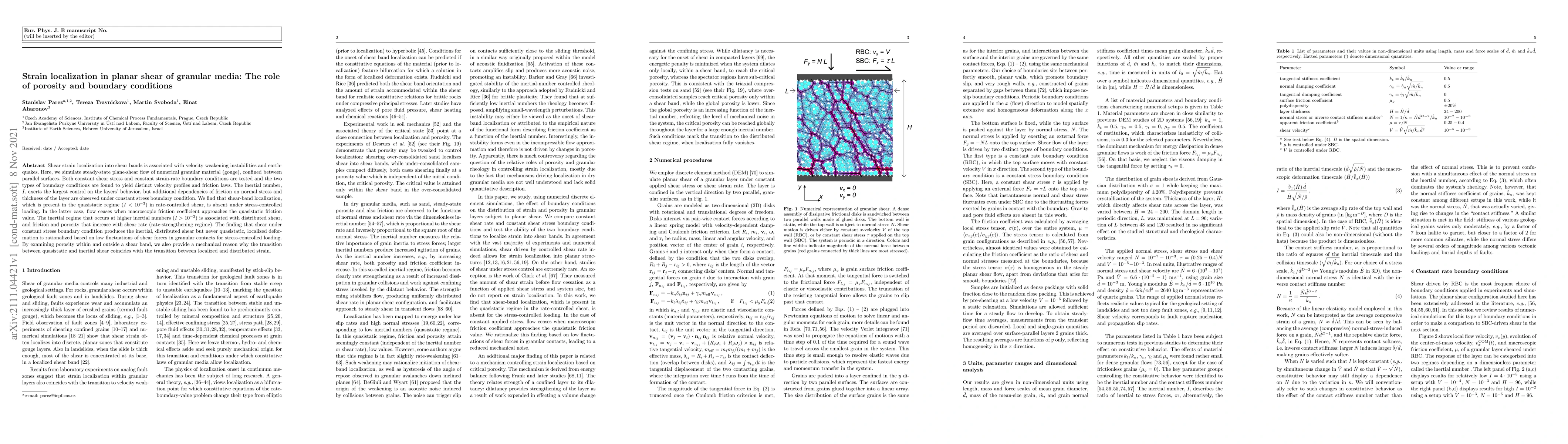 This paper investigates the strain localization in granular media under different boundary conditions, finding that constant shear stress conditions lead to distributed shear and increased friction, while constant strain-rate conditions result in localized shear bands. The study highlights the role of inertial number, porosity, and boundary conditions in determining the frictional behavior and strain localization patterns in granular materials.