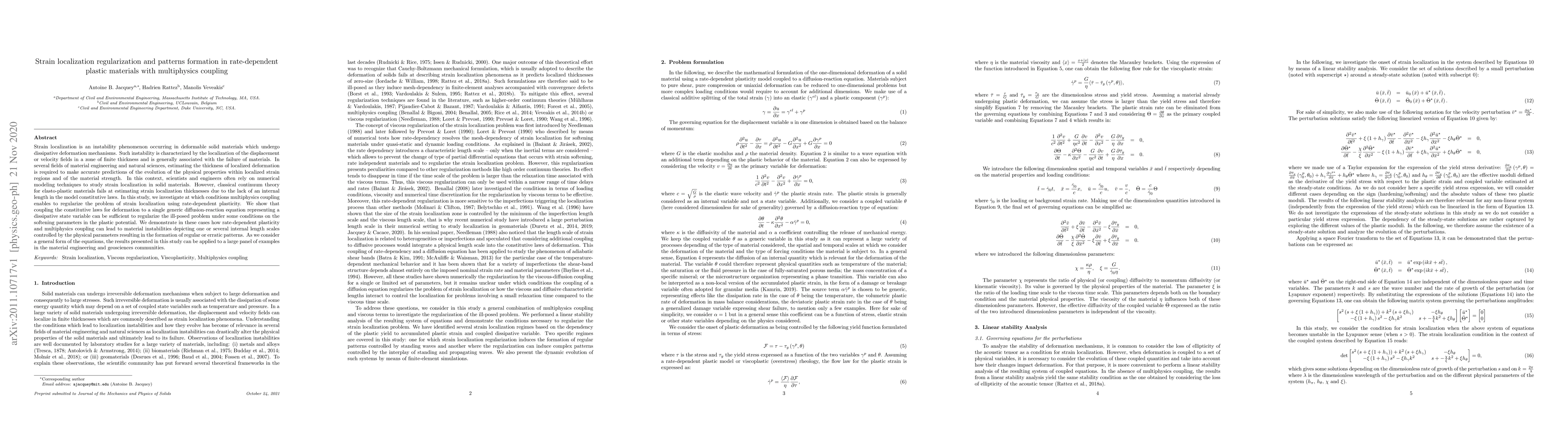 This paper investigates the regularization of strain localization in rate-dependent plastic materials through multiphysics coupling, demonstrating that coupling constitutive laws to a diffusion-reaction equation can introduce internal length scales and lead to the formation of regular or erratic patterns, thus improving predictions of material behavior.