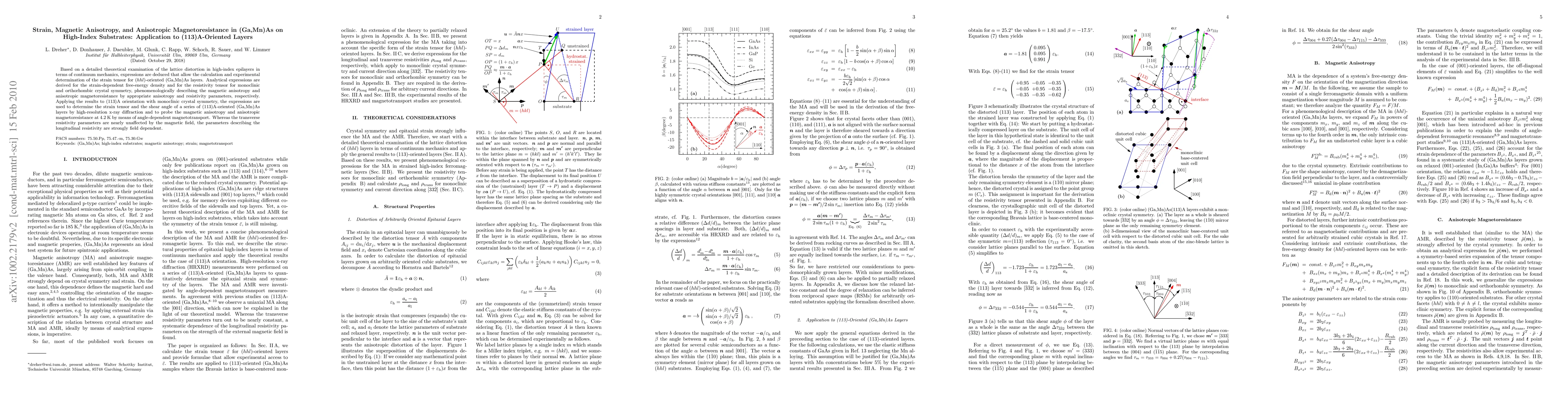 This paper theoretically examines lattice distortion and strain in (Ga,Mn)As epilayers on high-index substrates, deriving expressions for strain tensor, magnetic anisotropy, and anisotropic magnetoresistance. Experimental results on (113)A-oriented layers show strong field dependence in longitudinal resistivity parameters.