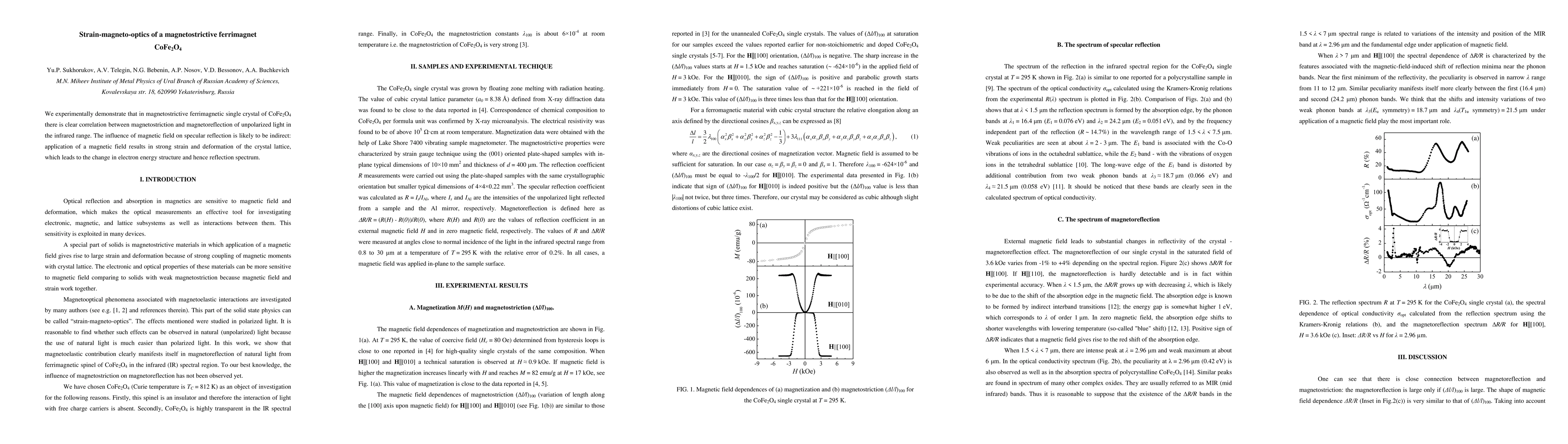 We experimentally demonstrate that in magnetostrictive ferrimagnetic single crystal of CoFe2O4 there is clear correlation between magnetostriction and magnetoreflection of unpolarized light in the infrared range. The influence of magnetic field on specular reflection is likely to be indirect: application of a magnetic field results in strong strain and deformation of the crystal lattice, which leads to the change in electron energy structure and hence reflection spectrum.